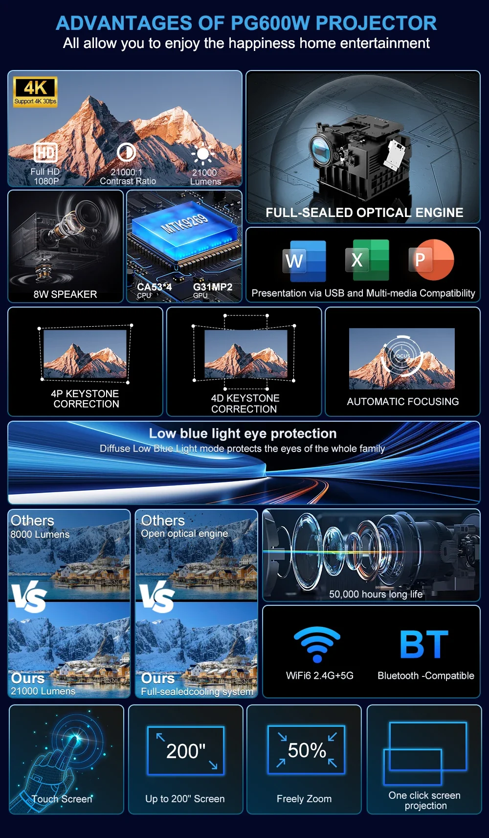 Además, el proyector de vídeo WiFi 4P4D y PG600W también le permite ajustar manualmente la imagen vertical/horizontal/4 esquinas.Supera ángulos de las limitaciones de la habitación de varias maneras y aporta flexibilidad a la proyección frontal/lateral/techo.