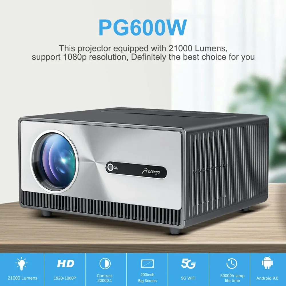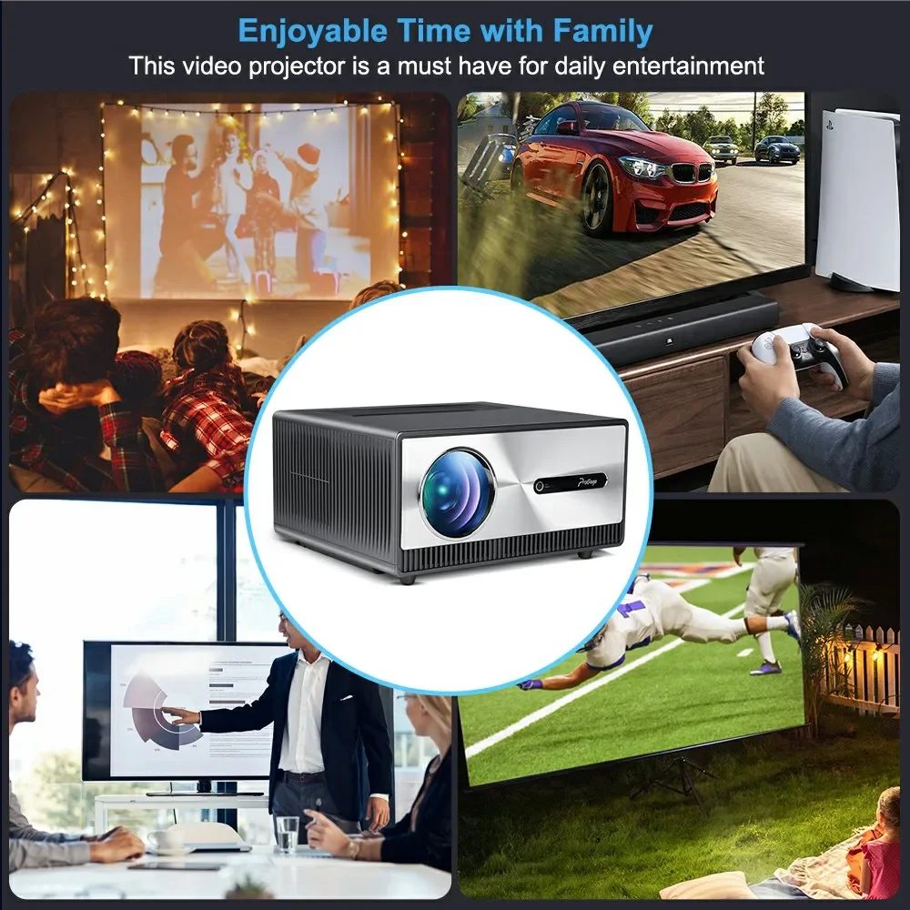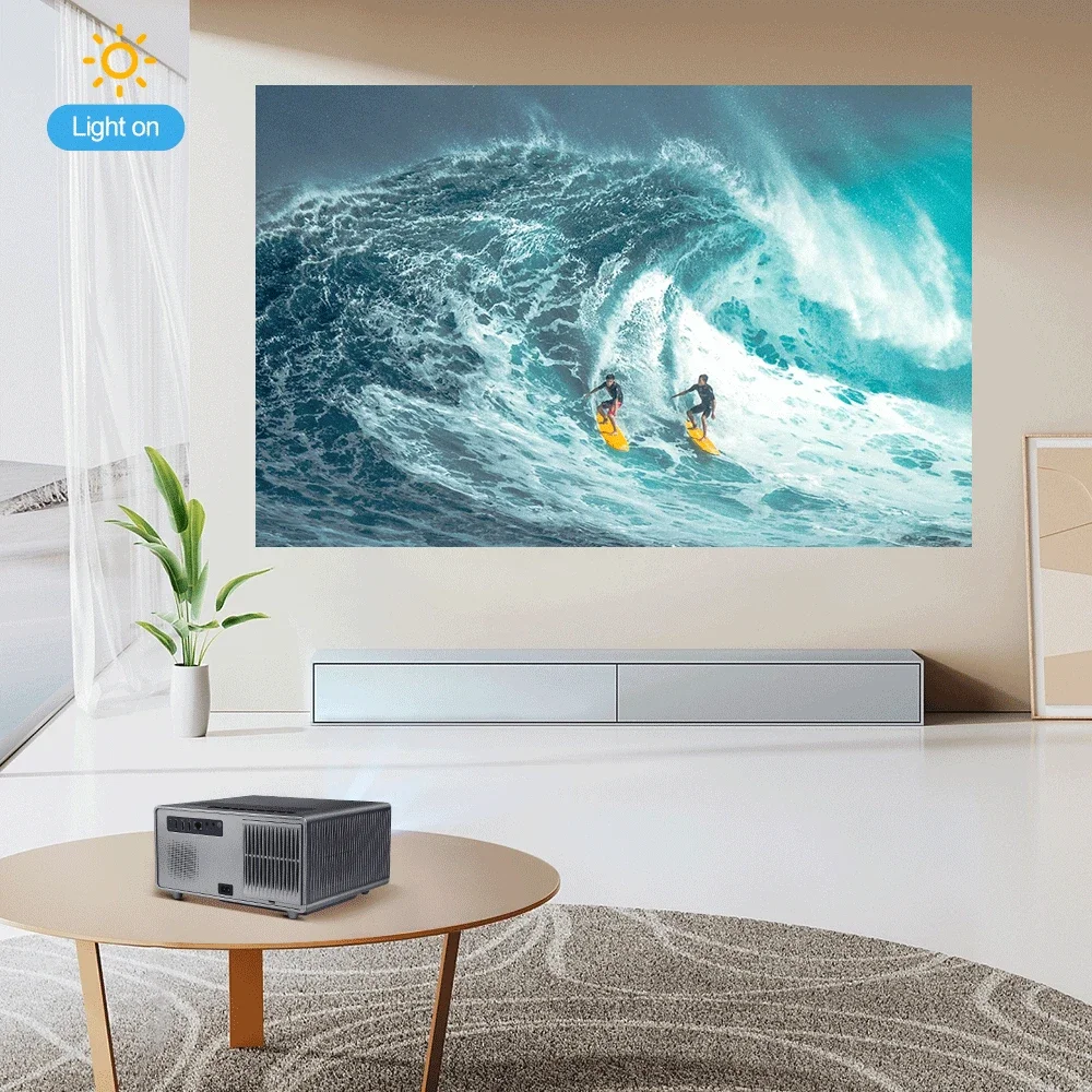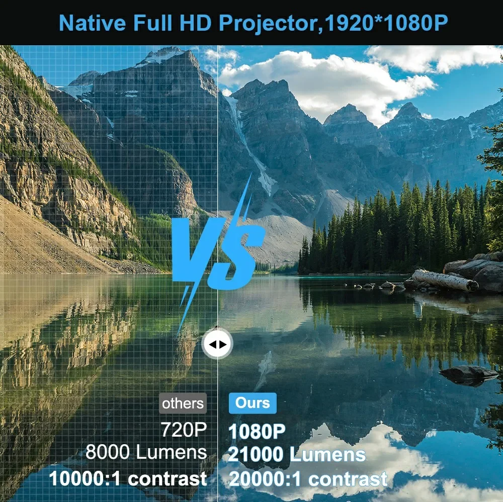 El proyector nativo Full HD de 1080p con resolución nativa de 1920*1080P, brillo de 21000 lúmenes y contraste de 20000: 1, proporciona una fidelidad de imagen superior y una precisión de color precisa.Además, admite decodificación de vídeos ultra HD 4K (formato H.265 30 fps/MP4), restaurando la calidad de vídeo Full HD con excelentes detalles de sombras.El proyector de soporte 4k te brindará una experiencia de cine en casa y también es una excelente opción para disfrutar de noches de cine al aire libre, noches de FIFA o noches de juegos.