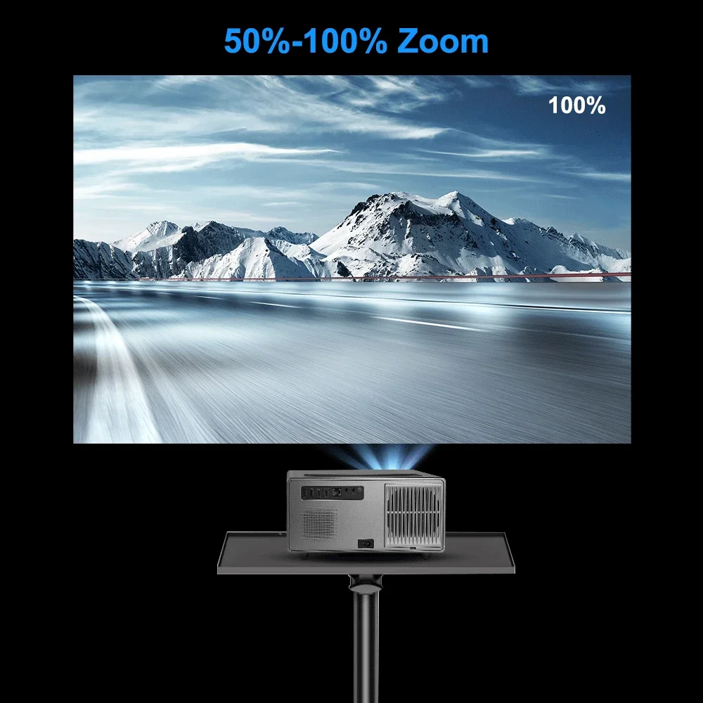 Los proyectores pequeños vendidos en el mercado generalmente tienen una función de zoom del 100 al 75%, pero nuestro proyector puede ajustar el tamaño de la pantalla entre un 100 y un 50 % a una distancia fija y ajustar frecuentemente la distancia de proyección del proyector.Es conveniente sin necesidad.