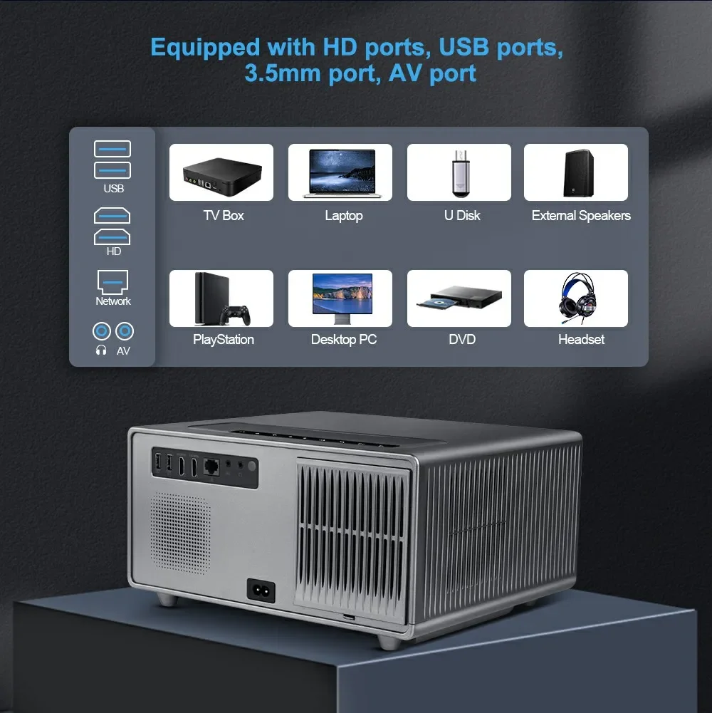 El proyector es compatible con TV BOX, TV Stick, computadora portátil, USB, computadora, PS3, PS4, Switch, etc., admite interfaces HDMI, USB, AV y de 3,5 mm para tarjetas de TV, computadoras portátiles y teléfonos.Viene preinstalado con un práctico software, lo que mejora la compatibilidad y admite la reproducción directa de videos locales, imágenes, música y PPT.Es una opción ideal para oficinas, exteriores, Navidad.
