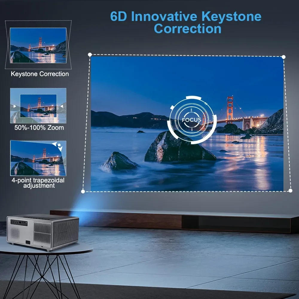 ¡Obtenga una imagen rectangular clara en solo 1 segundo después de encenderlo!Cuenta con tecnología de enfoque automático, lo que le permite controlar el proyector de forma remota en cualquier momento y en cualquier lugar.El último sensor de desplazamiento puede detectar instantáneamente el movimiento del proyector y corregir la imagen trapezoidal de inmediato.