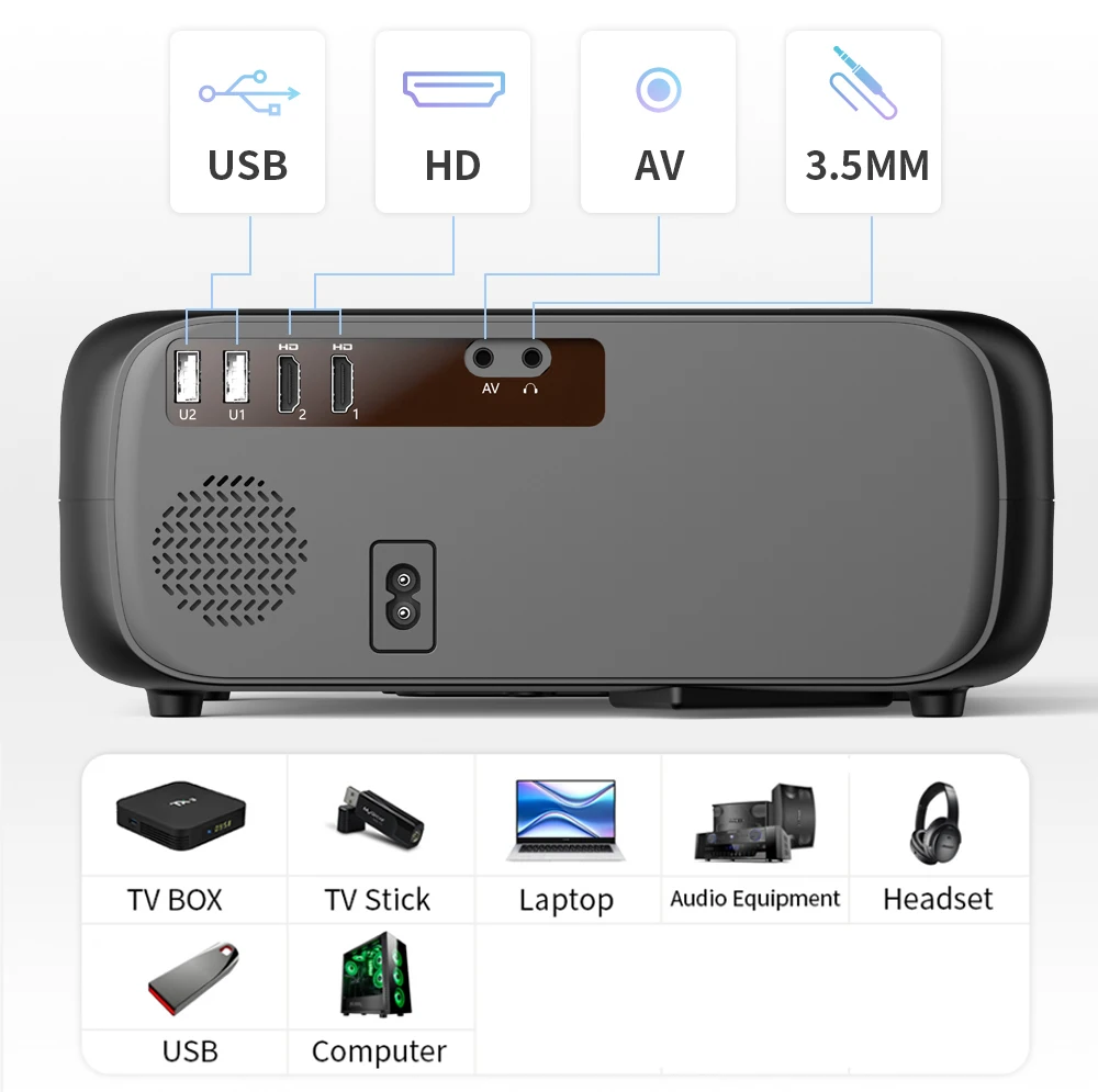 this projector easily connects with TV Box, TV Stick , Chromecast, PC, laptop, tablet, external speakers, for game player , DVD player,Flash disk