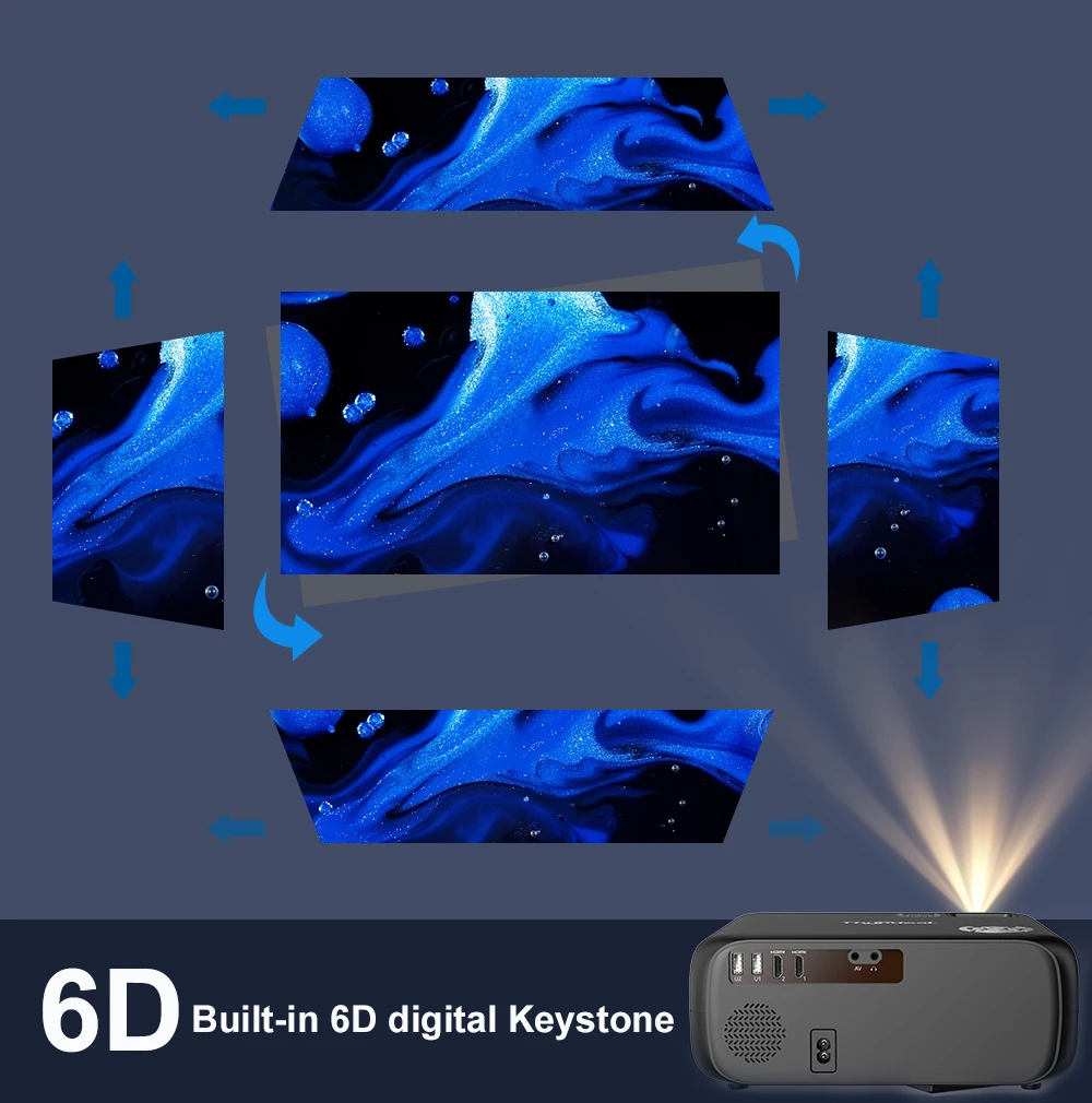 - Play store: Download and install APP- 6D Keystone : support 4 point Corner keystone correction for side projection +/- 60 Degree ,and +/- 60 Degree vertical keystone (use remote control)