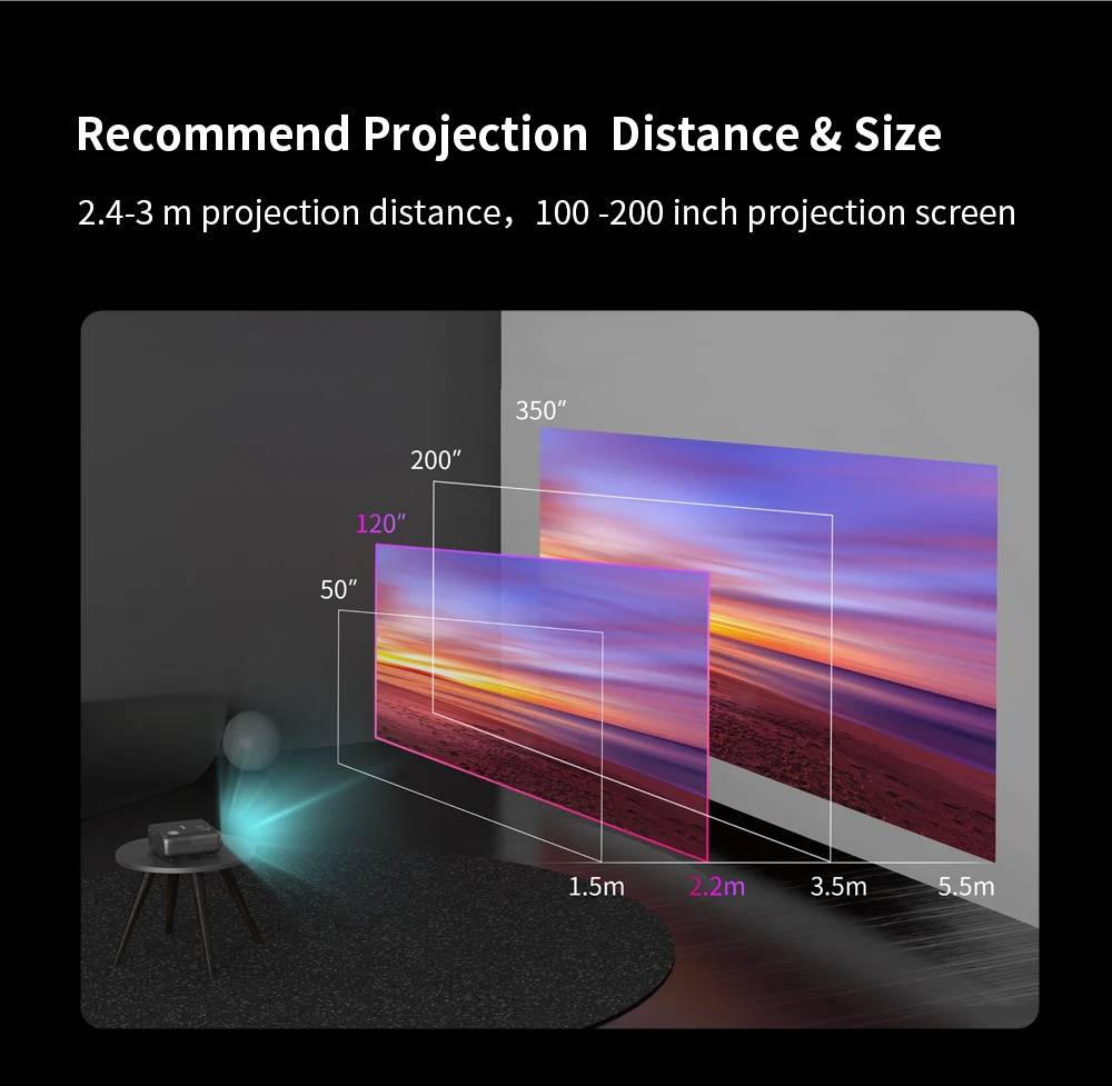 We suggest 3-5 m projection distance,93 -150 inch projection screen and ambient darkness, which is the best eye-protection and enjoy distance.