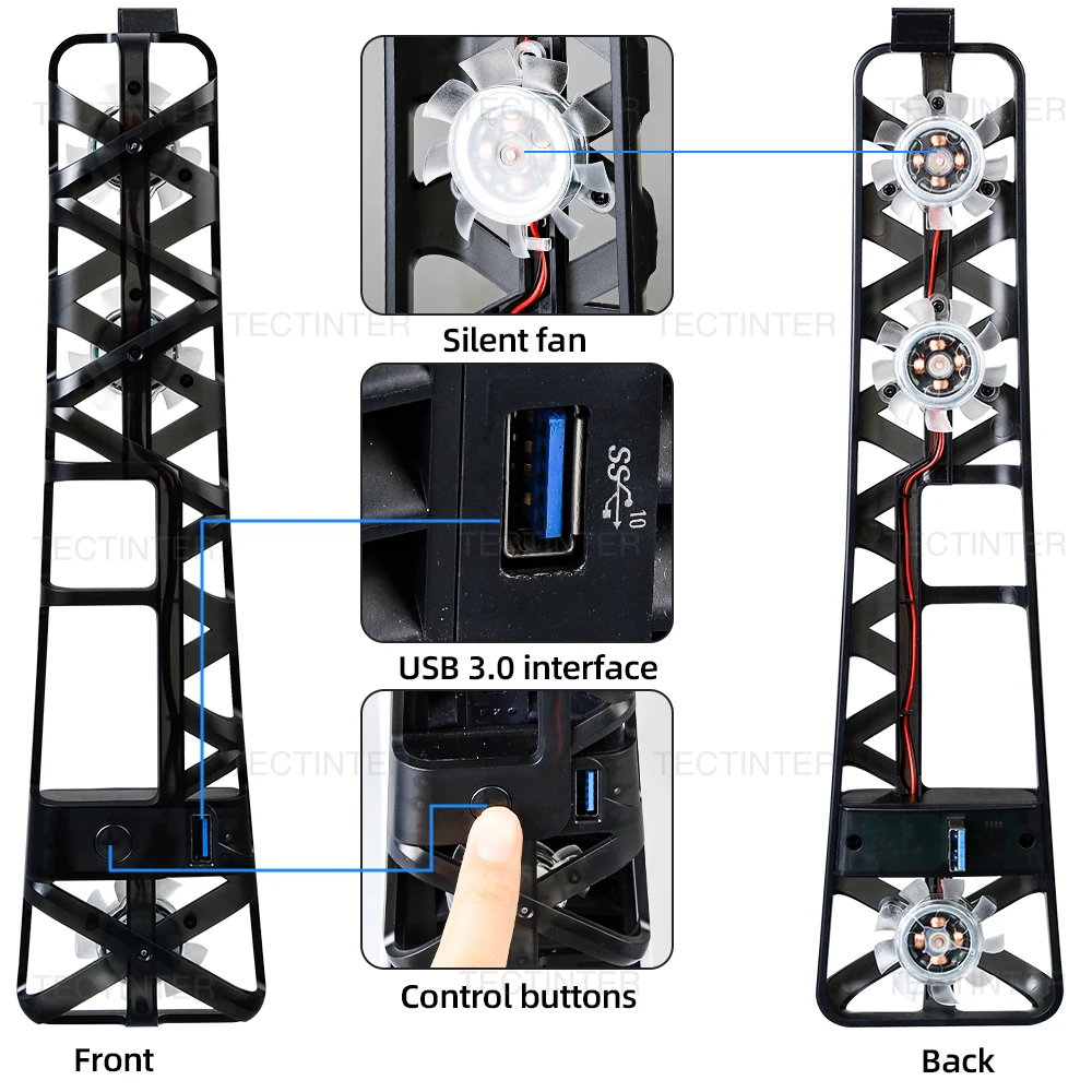 Estos ventiladores de refrigeración se alimentan directamente a través de uno de los puertos USB-A en la parte posterior de la consola, lo que hace que la instalación sea sencilla y sin complicaciones sin necesidad de fuentes de energía adicionales.El estado activo está indicado por los LED encendidos, emitiendo una luz azul.