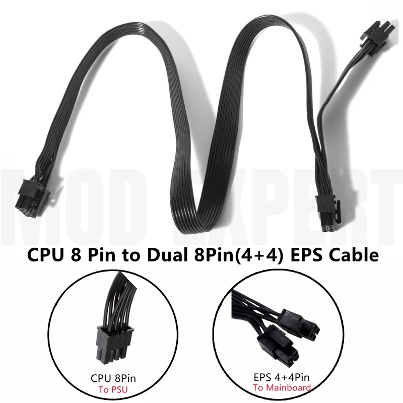 Our power supply units (PSUs) use an 8-pin EPS12v. CPU cable that can be split into two 4-pin connectors. If you want to connect our PSU into a 4-pin EPS motherboard port, simply pull the two halves of the connector apart and connect one half into the motherboard port. PSU 8Pin and EPS 4+4Pin male cannot be used interchangeably!