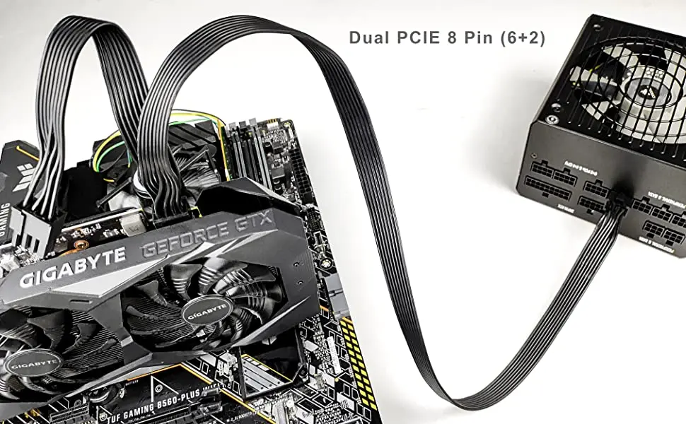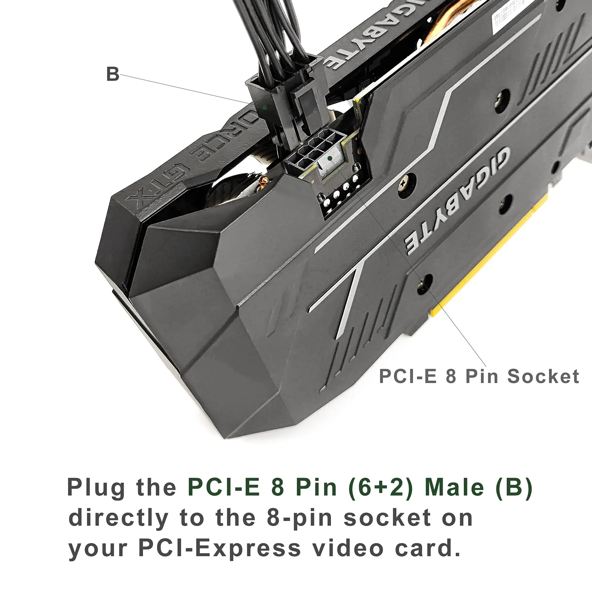3.El cable PCIe se puede utilizar como 6 pines u 8 pines deslizando hacia adentro/apagando los 2 pines.Compatible con tarjetas de vídeo PCI-E que tienen una toma de corriente de 8 pines, 6 pines o 8 pines + 6 pines.Como ASUS, ASRock, Gigabyte, Radeon, Sapphire, NVIDIA Tesla GPU, etc.Potencia de soporte para GTX1080, GTX1080Ti, RTX2060, RTX2070, RTX2080, RTX2080Ti, RTX3060, RTX3070, RTX3080 Ti, RTX3090 Ti, RX570, RX580, RX590, RX5700 XT, RX6700 XT, RX6800 XT, RX6900 XT.