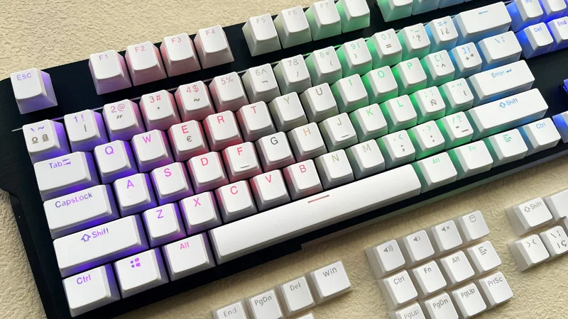 Para un Razer Huntsman V2 Analog están todas las teclas pero, la ñ no está iluminada y los demás caracteres especiales tampoco. Pero la luz se ve muy bien y es el efecto que andamos buscando. Se podría ajustar más el layout a uno español, no es del todo todo español, tiene teclas comodín, es decir, que tienen teclas que en un layout español no existen.