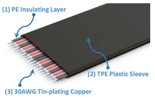El extensor utiliza los materiales más novedosos para el blindaje EMI con cinco diseños de cables planos. Esta técnica permite que cada cable esté completamente cubierto por blindaje de interferencia electromagnética con polímero conductor para proteger contra las emisiones entrantes o salientes de frecuencias electromagnéticas, minimizar las perturbaciones y la degradación del rendimiento, y reduce el peso del extensor.