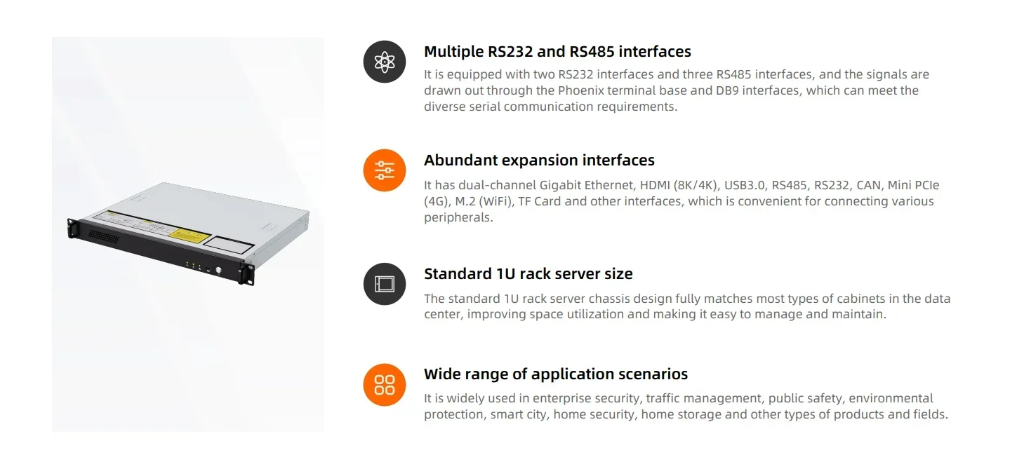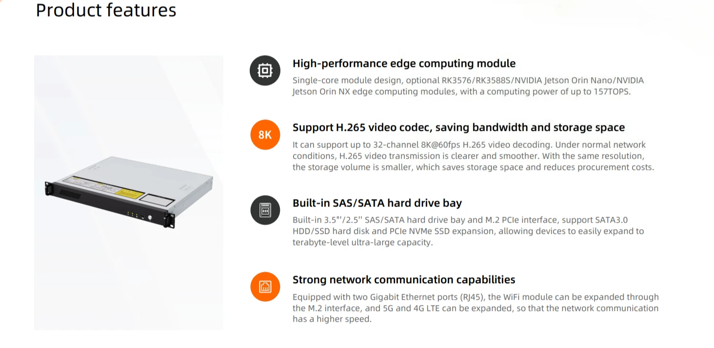 The GS1-N1 AI Gateway Server is a high-performance edge computing solution featuring 8K video encoding/decoding, versatile RS232/RS485 interfaces, and terabyte-level storage capacity. With support for optional edge computing modules, it delivers powerful AI processing, seamless connectivity, and massive data storage for industrial, surveillance, and smart applications.