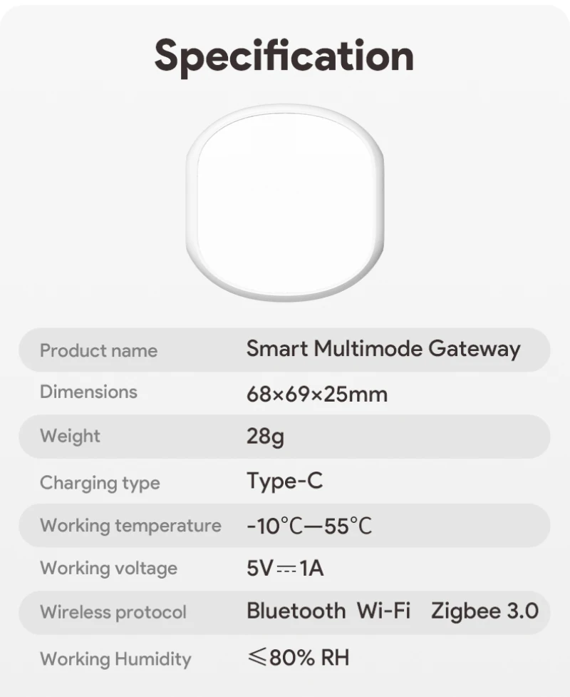 Gateway multimodo inteligente Dimensiones: 68*69*25mm Peso del sensor: 28G Tipo de batería: AAA