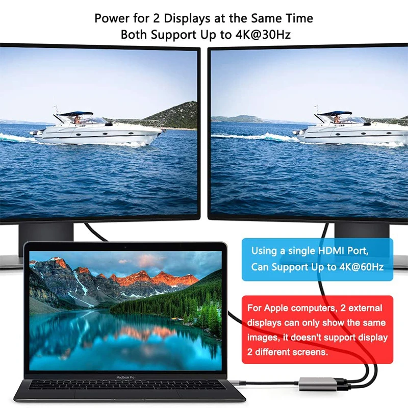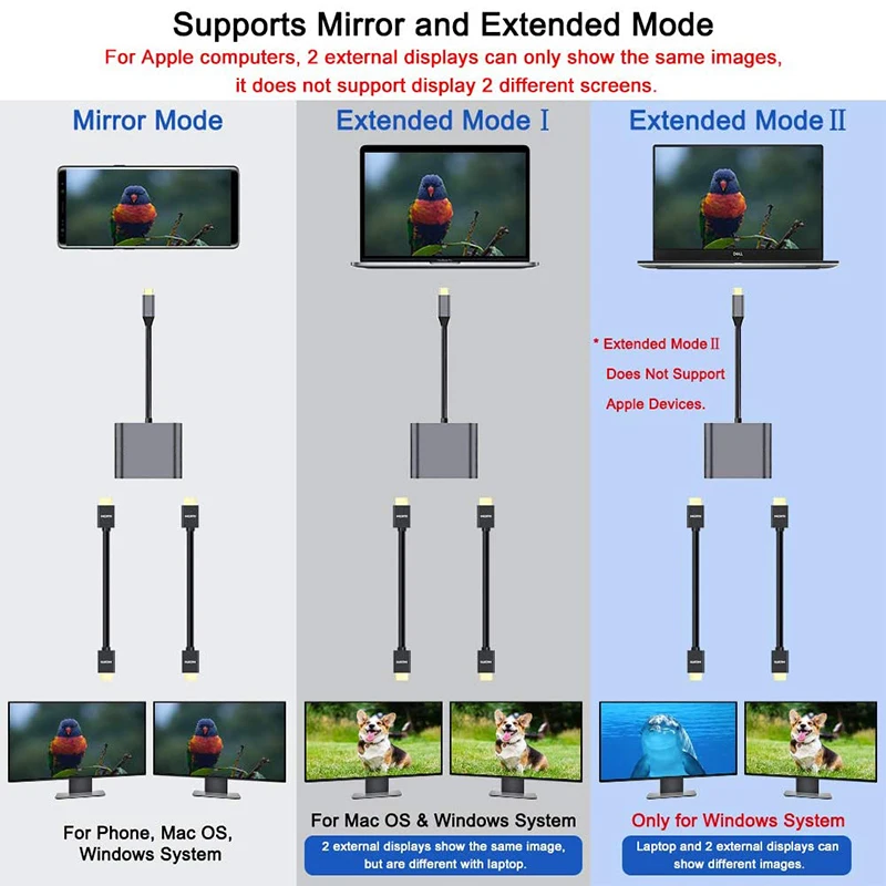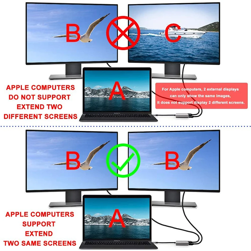 Para los ordenadores Apple, 2 pantallas externas solo pueden mostrar las mismas imágenes, no admite la visualización de 2 pantallas diferentes.