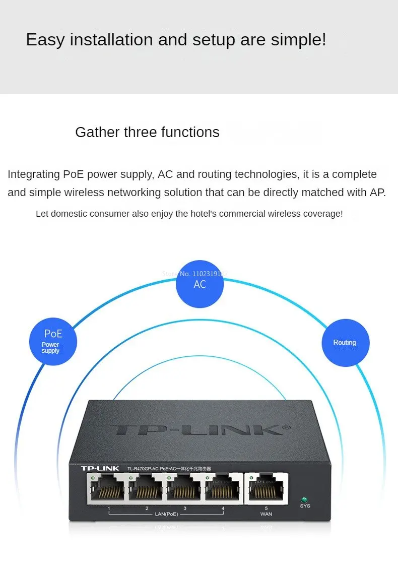 Se trata de un nuevo router integrado PoE · AC lanzado por el año pasado. La función integrada de CA (controlador inalámbrico) y fuente de alimentación PoE estándar de 4 puertos puede administrar y alimentar uniformemente productos de AP, simplificando la complejidad de las redes inalámbricas domésticas.