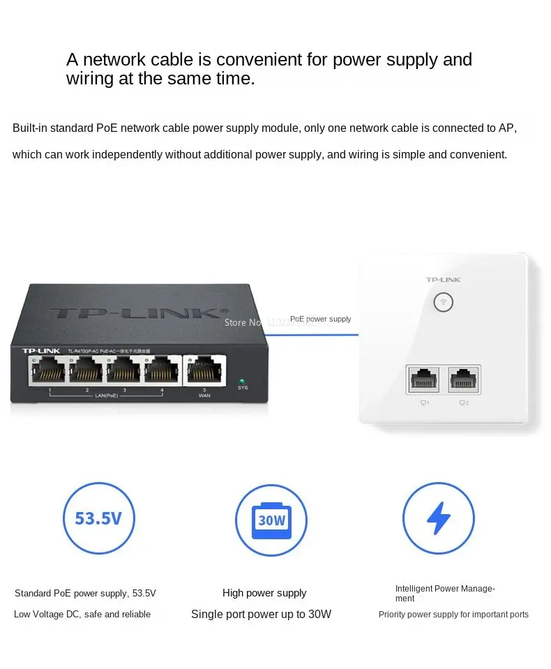 ~ El módulo de fuente de alimentación de cable de red PoE estándar incorporado puede funcionar de forma independiente con un solo cable de red conectado al AP, sin fuente de alimentación adicional, y el cableado es simple y conveniente.