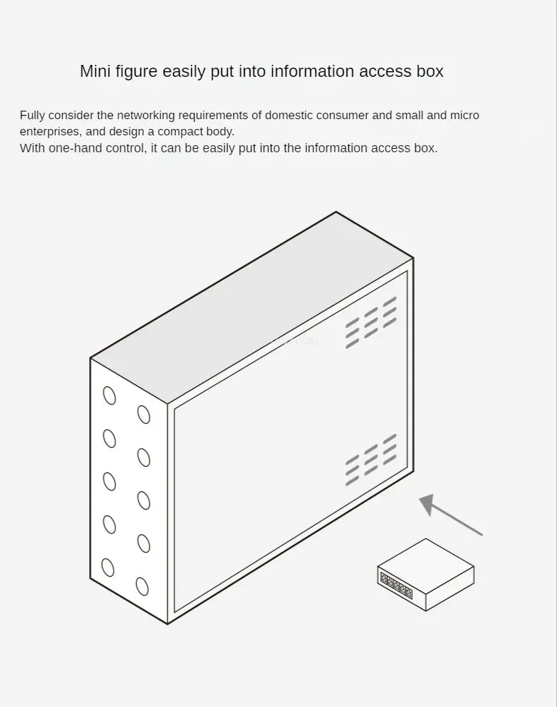 ~ Teniendo en cuenta completamente las necesidades de red de los usuarios domésticos y las pequeñas y microempresas, el módulo está diseñado con un cuerpo de tira, que se puede colocar fácilmente en el cuadro de información/caja de corriente débil.