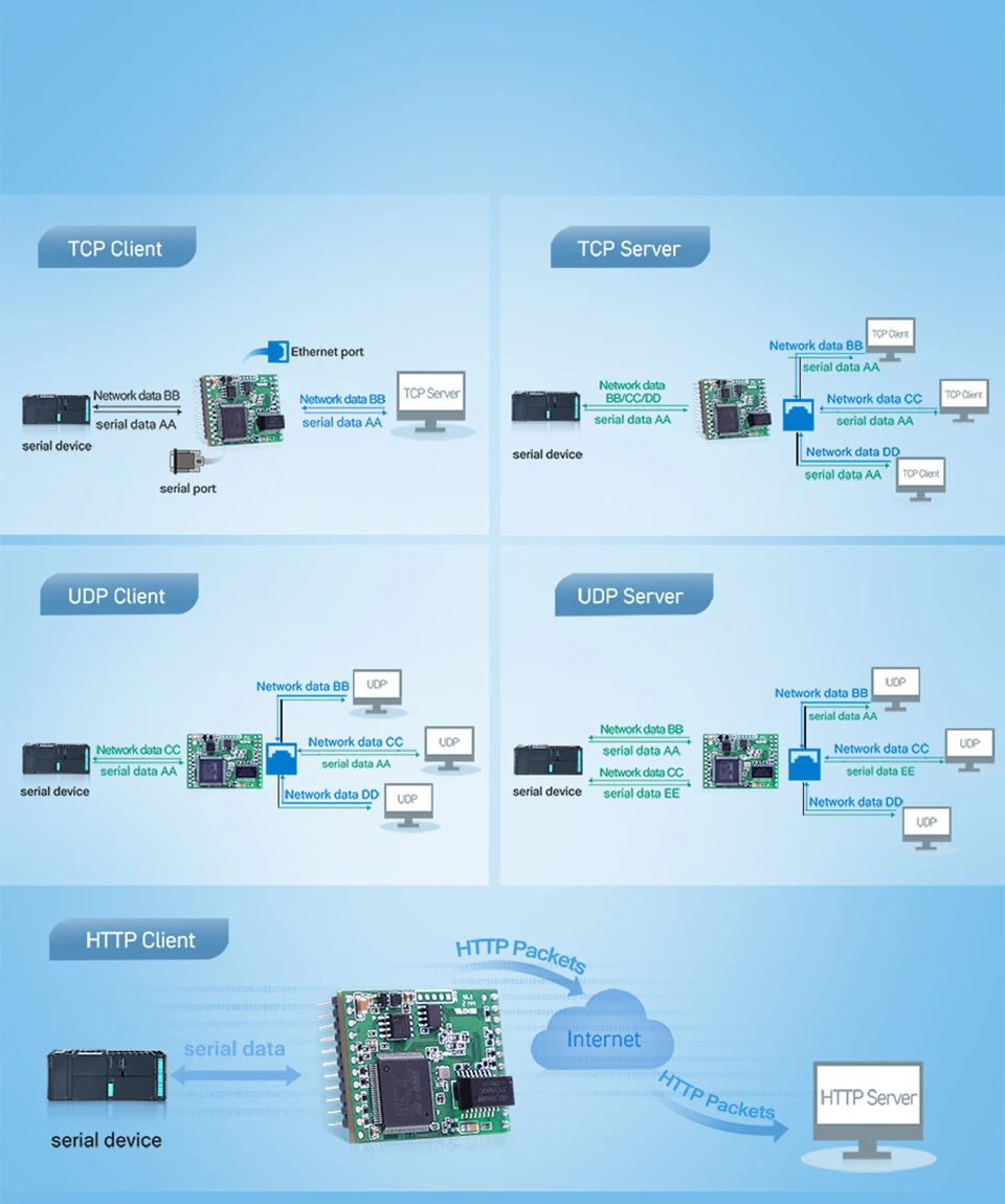 Este es un módulo TTL serial a Ethernet, utilizado para la transmisión transparente de datos. Es un módulo Ethernet de triple serie, que admite 3 * TTL trabajando al mismo tiempo. Se basa en la solución de la Cortex-M4 y su frecuencia básica es de hasta 120MHz. Y el interior del módulo integra la pila de protocolo TCP/IP.