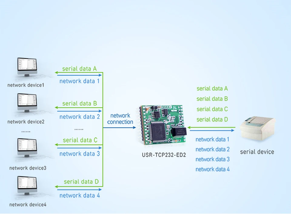 Modo cliente TCPEl módulo inicia la conexión a todos los servidores TCP establecidos, si la conexión falla, el módulo intentará volver a conectarse hasta el éxito si la conexión se realiza correctamente, el servidor transmitirá datos con el dispositivo serie.