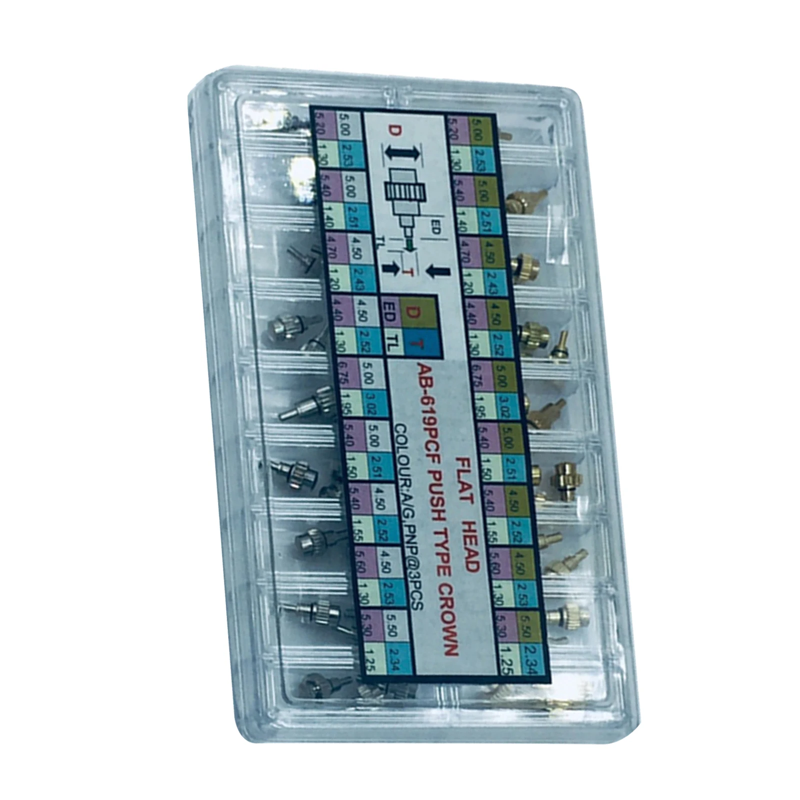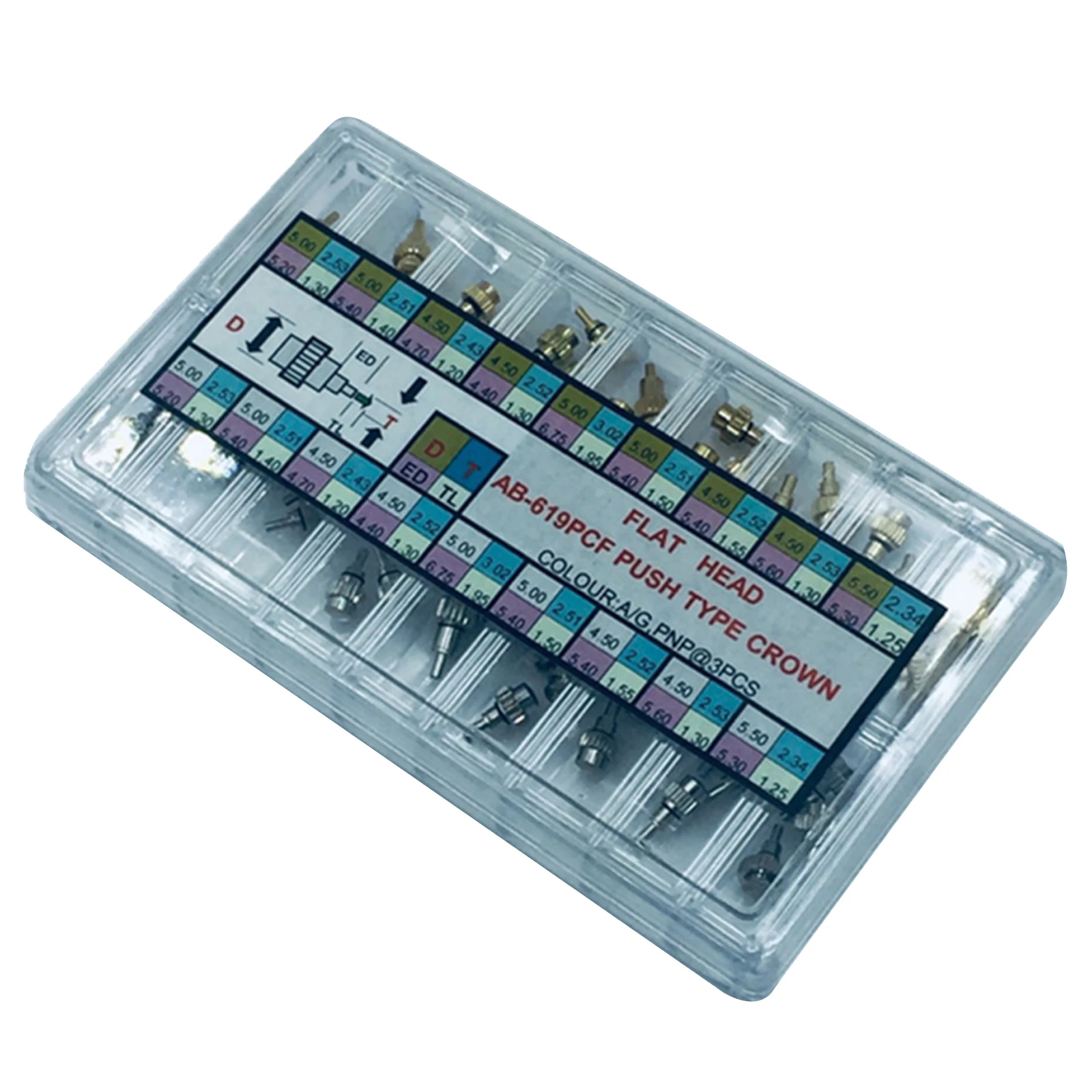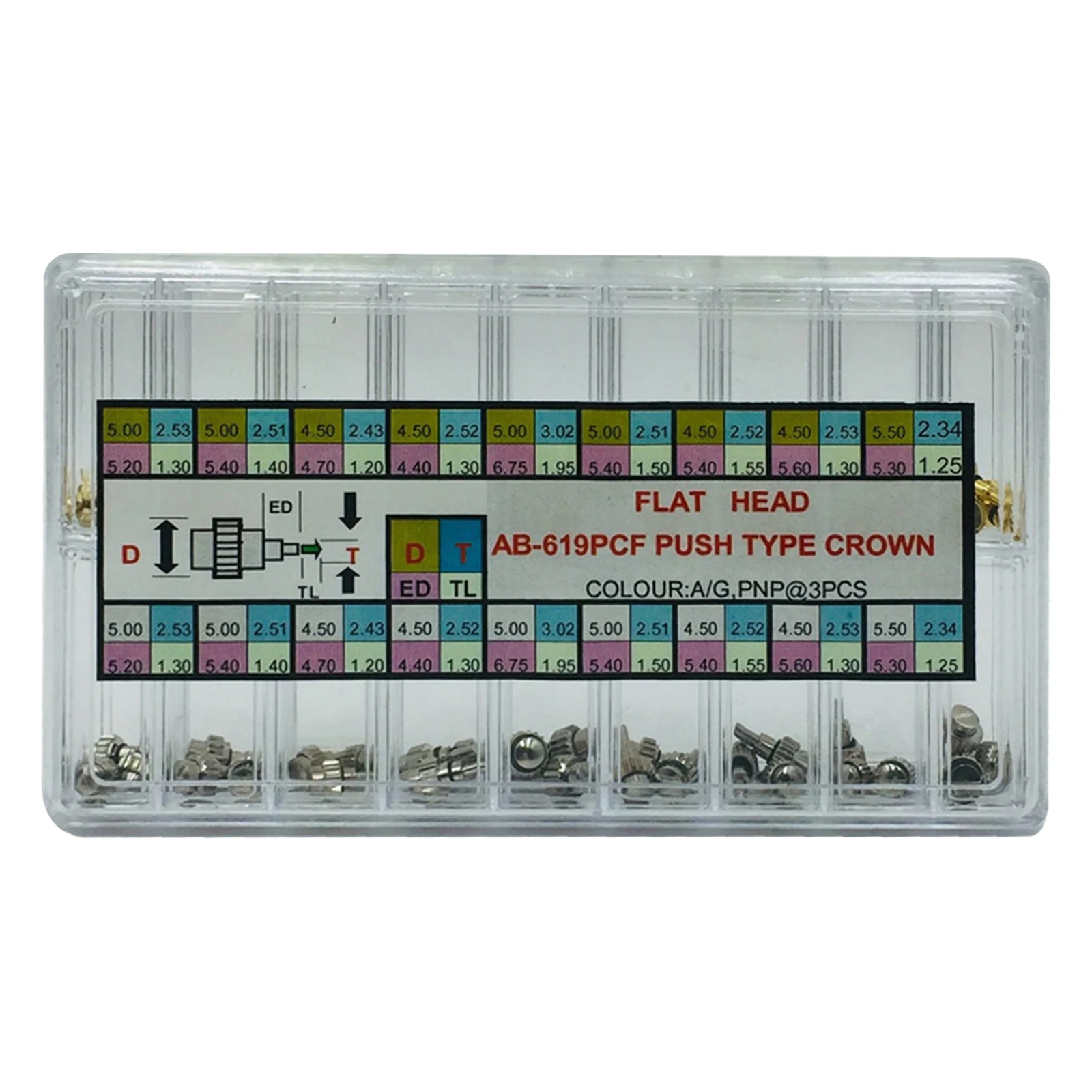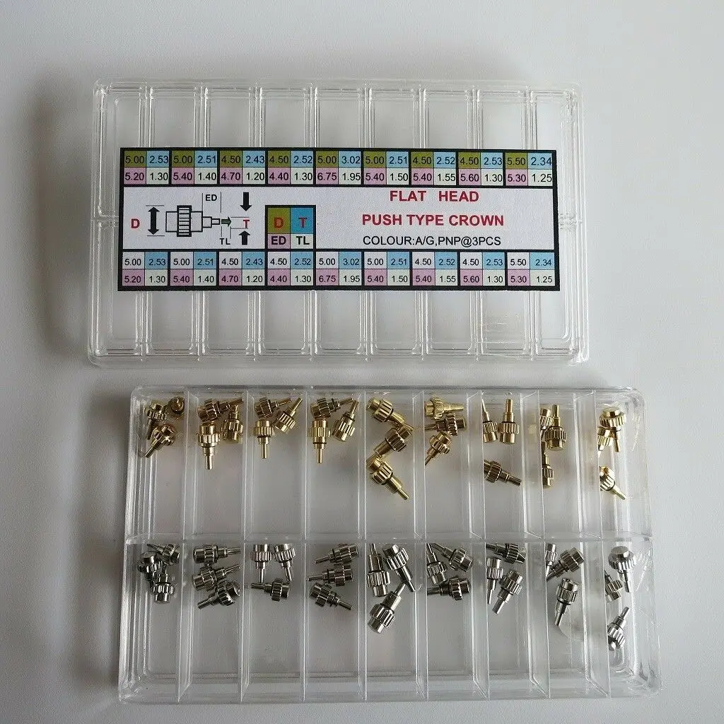 Comprar Pulsador de reloj de acero inoxidable, pulsador de corona de cabeza plana, tipo corona, 54 unids/lote por caja
