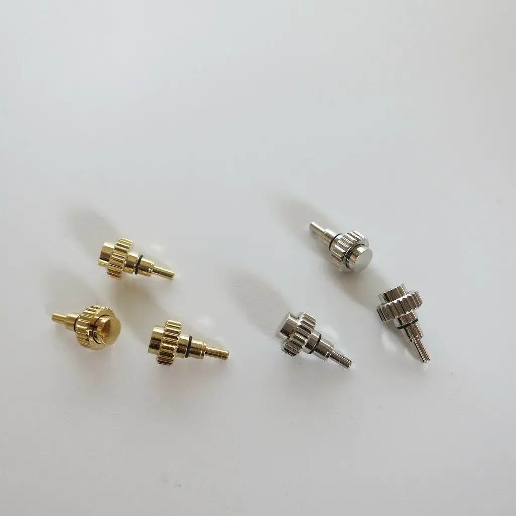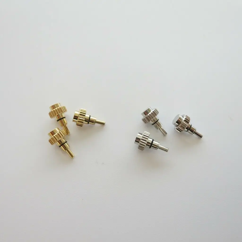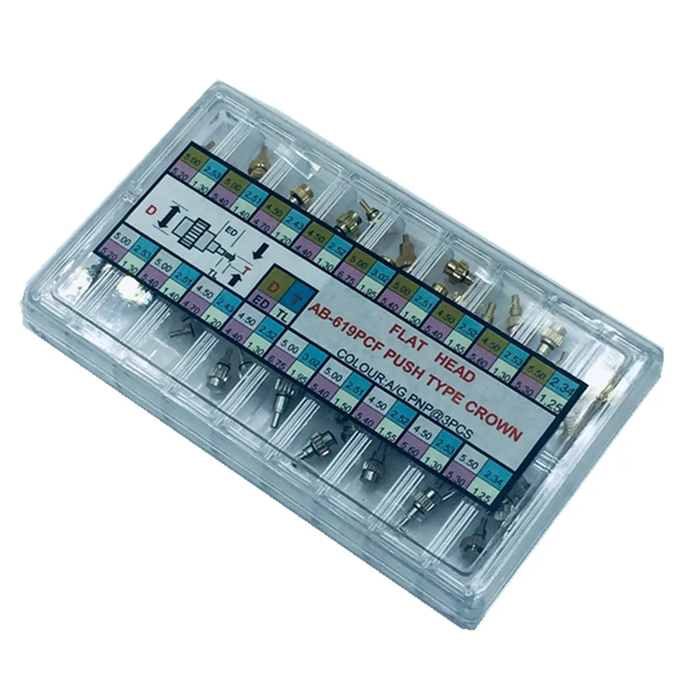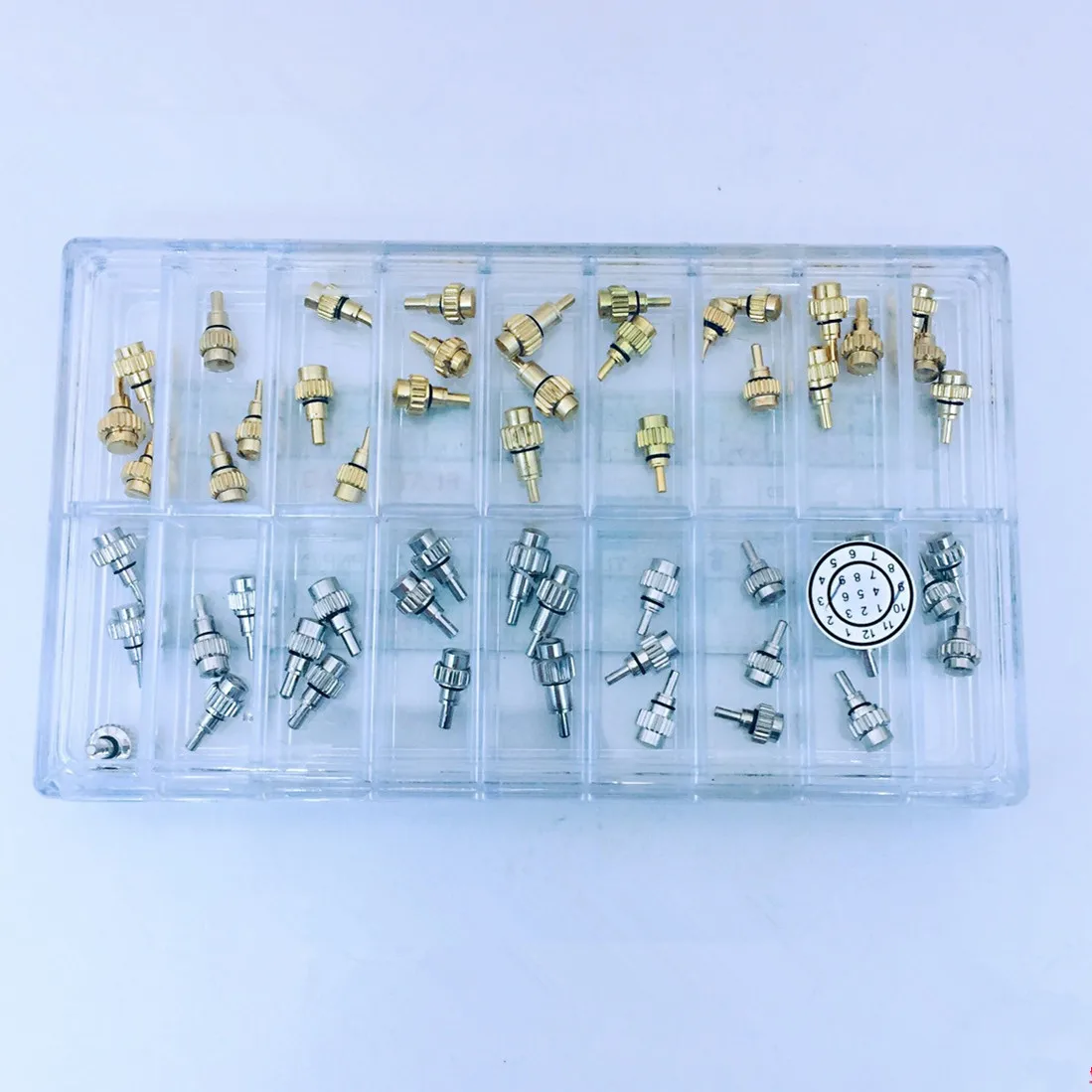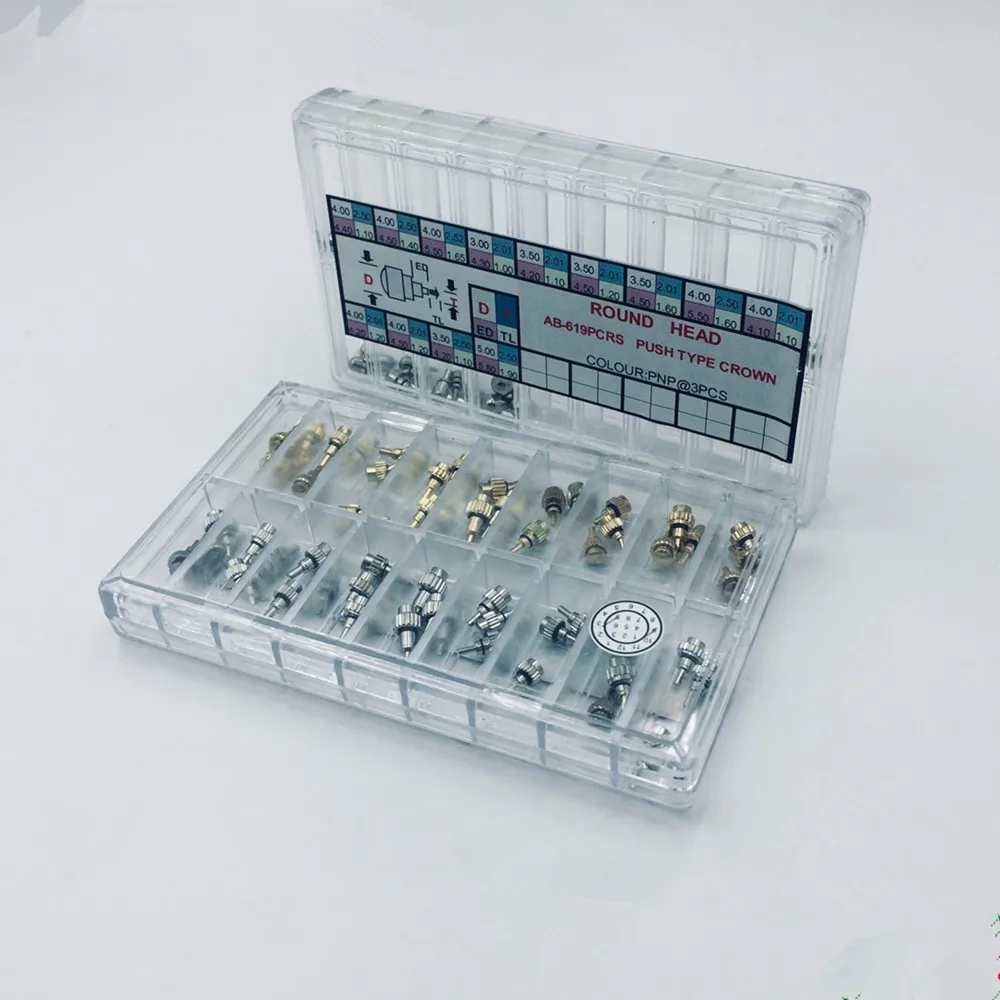 Comprar Pulsador de reloj de acero inoxidable, pulsador de corona de cabeza plana, tipo corona, 54 unids/lote por caja