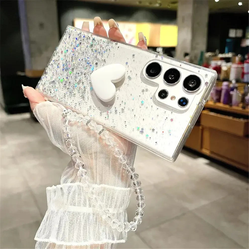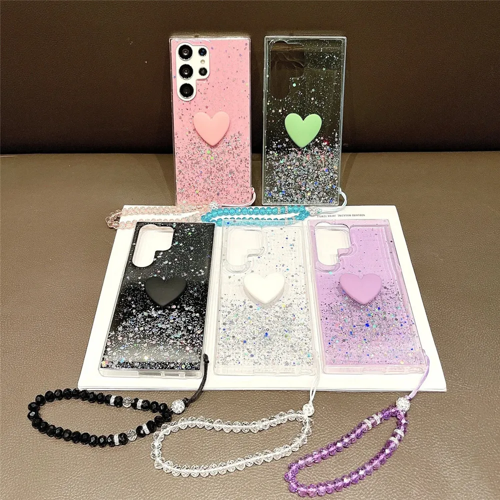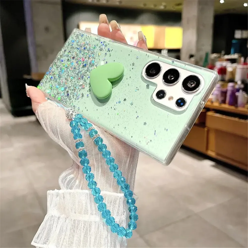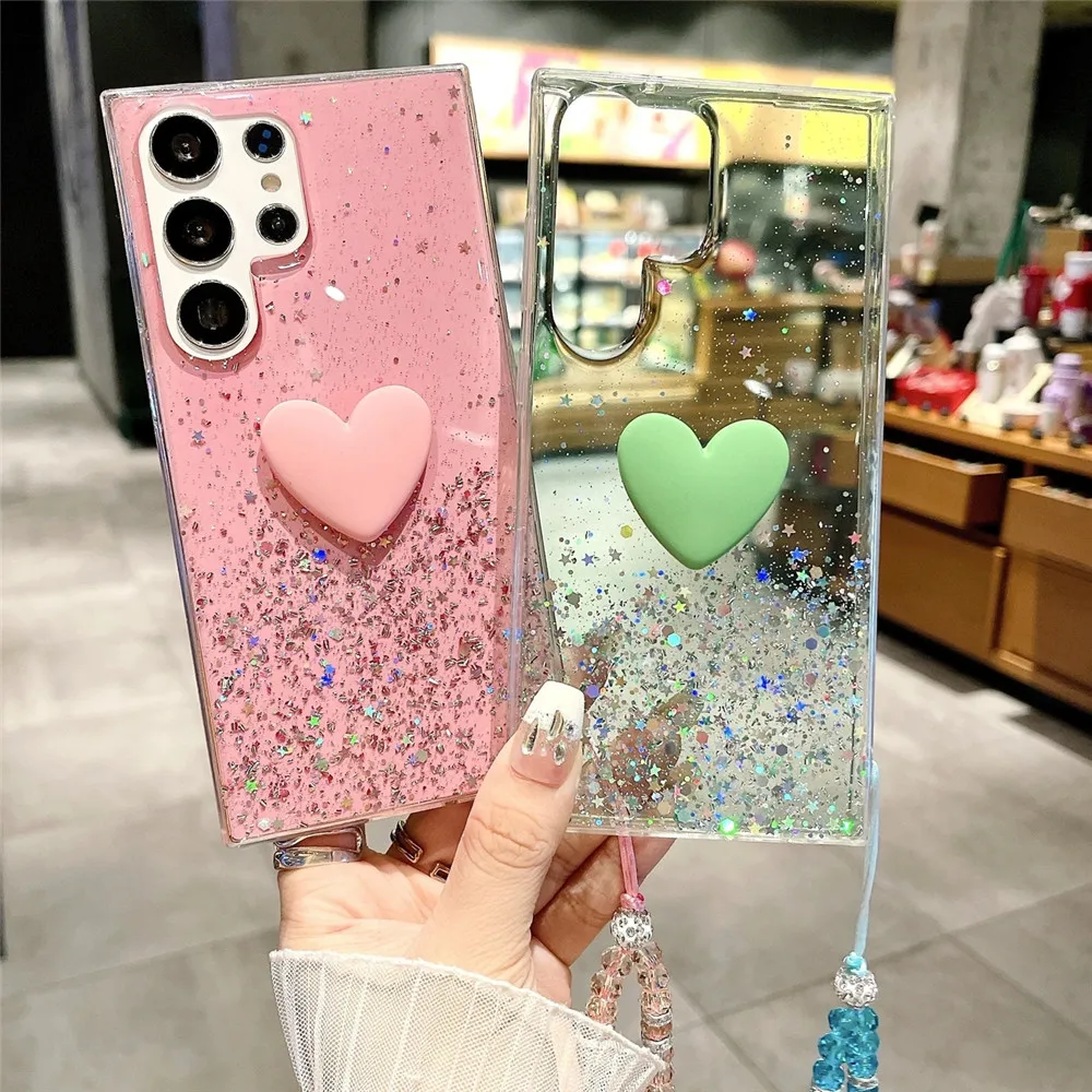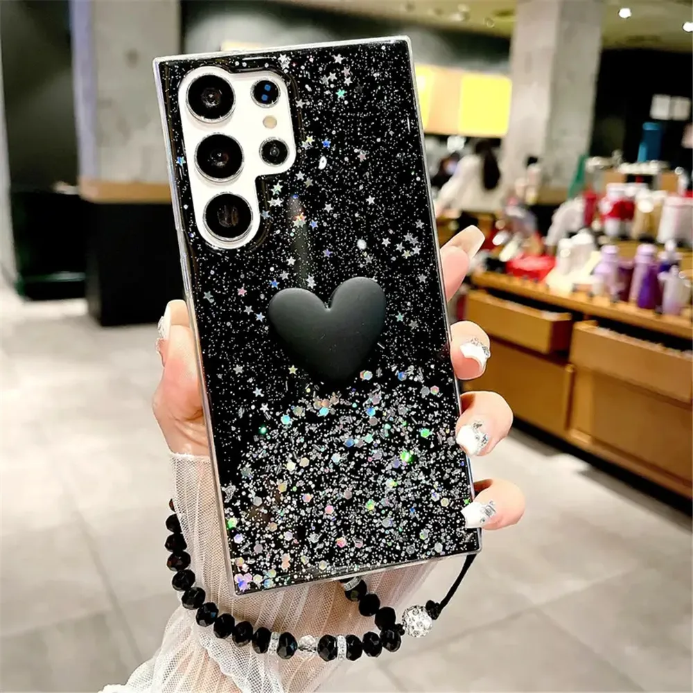 Pulsera de cristal 3D Funda con purpurina de corazón de amor para iPhone 16 15 14 13 12 11 Pro Max XR X XS Max 7 8 Plus Funda de silicona suave para teléfono