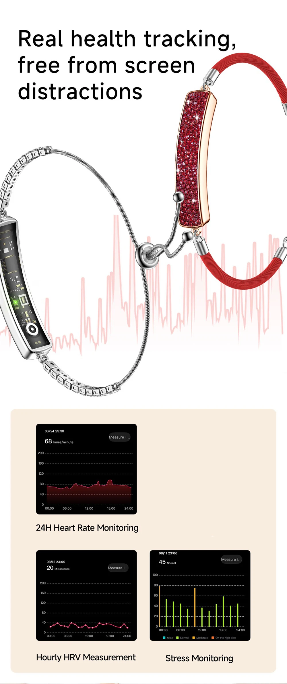 1.Wearable devices monitor human activities through electronic sensors. They are at the level of consumer electronics. It's normal to have certain deviation. The health test results of the watch are for reference only, and can not be compared with medical equipment. When the watch is placed on the surface of the object, there will be heart rate / blood pressure and other test results. It is normal and not a product defect.