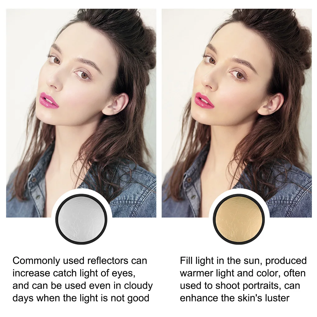 2 en 1: Este reflector plegable tiene un lado dorado y plateado que se puede voltear fácilmente y utilizar para satisfacer sus diferentes necesidades.