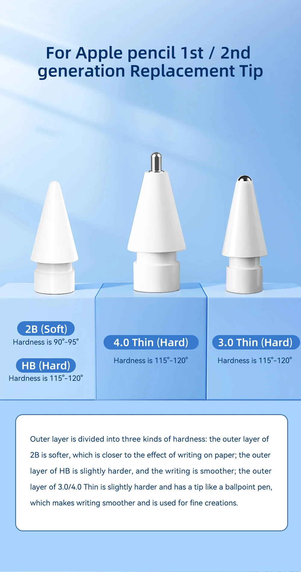 La capa exterior se divide en tres tipos de dureza: La capa exterior de 2B es más suave, que está más cerca del efecto de escribir en el papel; la capa exterior de HB es ligeramente más dura, Y la escritura es más suave; La capa exterior de 3,0/4,0 delgada es ligeramente más dura y tiene una punta como un bolígrafo, lo que hace que la escritura sea más suave y se utiliza para creaciones finas.