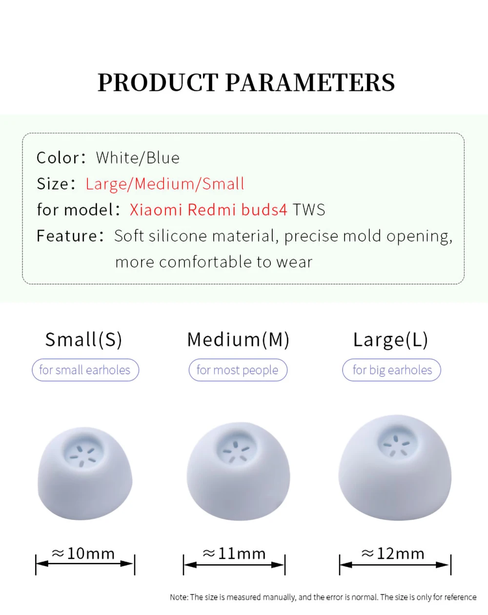 Adecuado para: Xiaomi Redmi Buds4 TWS Earbuds y otros auriculares inalámbricos del mismo tamaño.Características: alta calidad, diseño de material de silicona suave, la calidad es muy buenaColor: blanco, azulTamaño: S 10mm, M 11mm, L 12mm