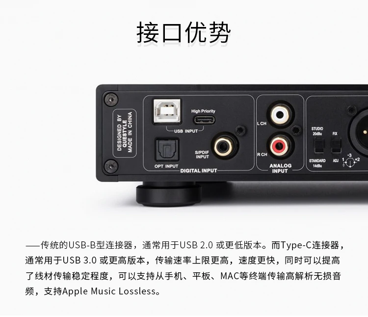 ▲El conector USB tradicional se suele utilizar para USB 2.0 o inferior.El conector tipo C se utiliza generalmente para conectores USB 3.0 o superiores, con un límite superior de velocidad de transmisión más alto y una velocidad más rápida.Al mismo tiempo, puede mejorar la estabilidad de la transmisión por cable, admitir la transmisión de audio sin pérdidas de alta resolución desde teléfonos móviles, tabletas, MAC y otros terminales, y admitir Apple Music sin pérdidas.