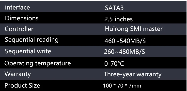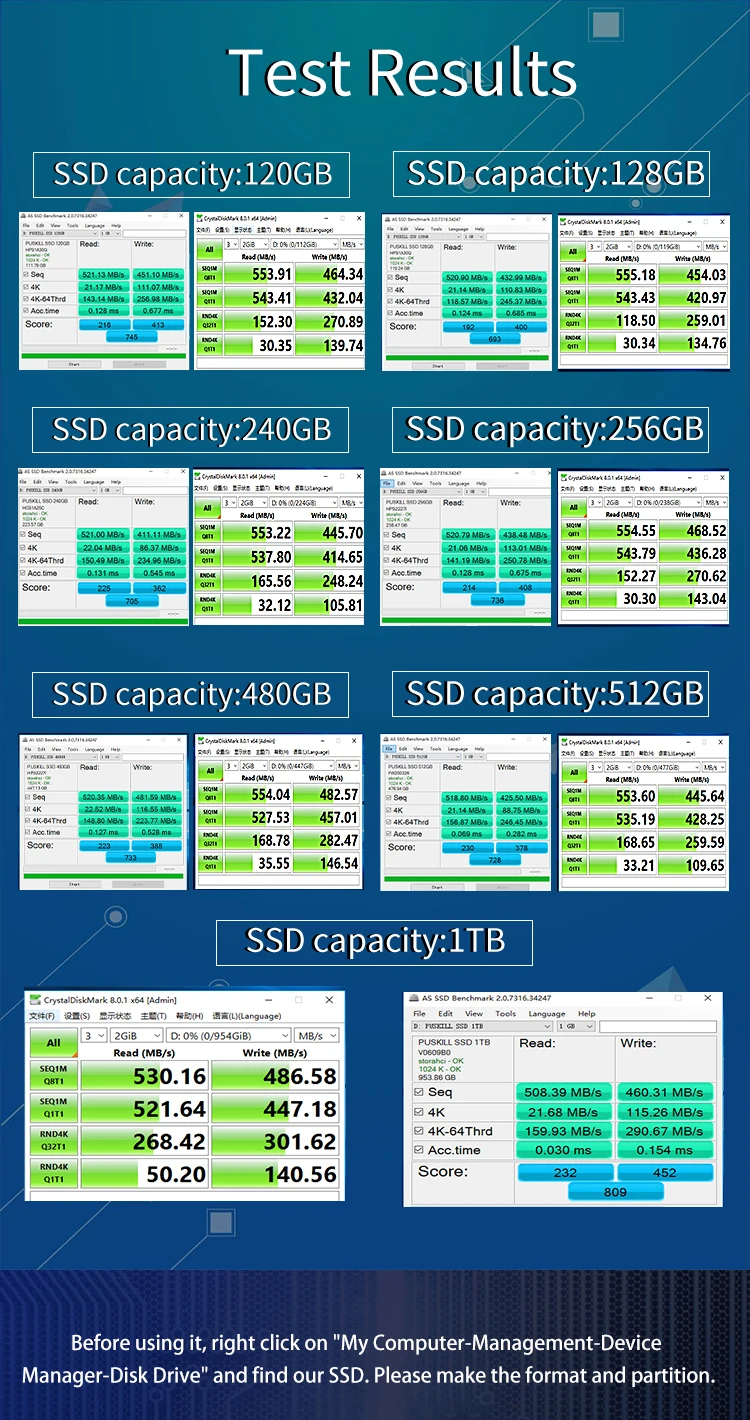 Nuestros resultados de la prueba se basan en la interfaz SATA III, cable SATA III, escritorio y SSD estado vacío, computadora y software (incluida la versión de software) son diferentes, los resultados pueden ser diferentes.