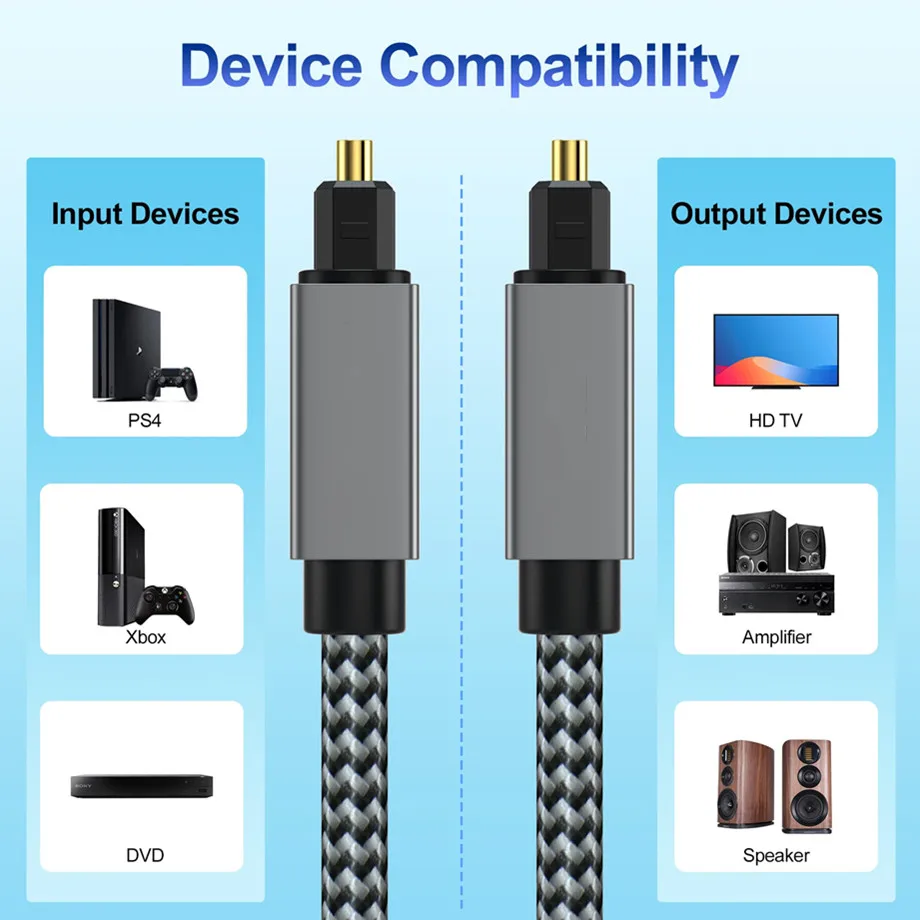 2.[Soporte multidispositivo]: los cables de audio de fibra óptica le permiten conectar su estéreo o cine en casa a su barra de sonido, TV, PS4/5, Sony, Bose, Y más dispositivos con puertos estándar Toslink (S/PDIF, fibra, óptica) para un mayor disfrute en su vida.