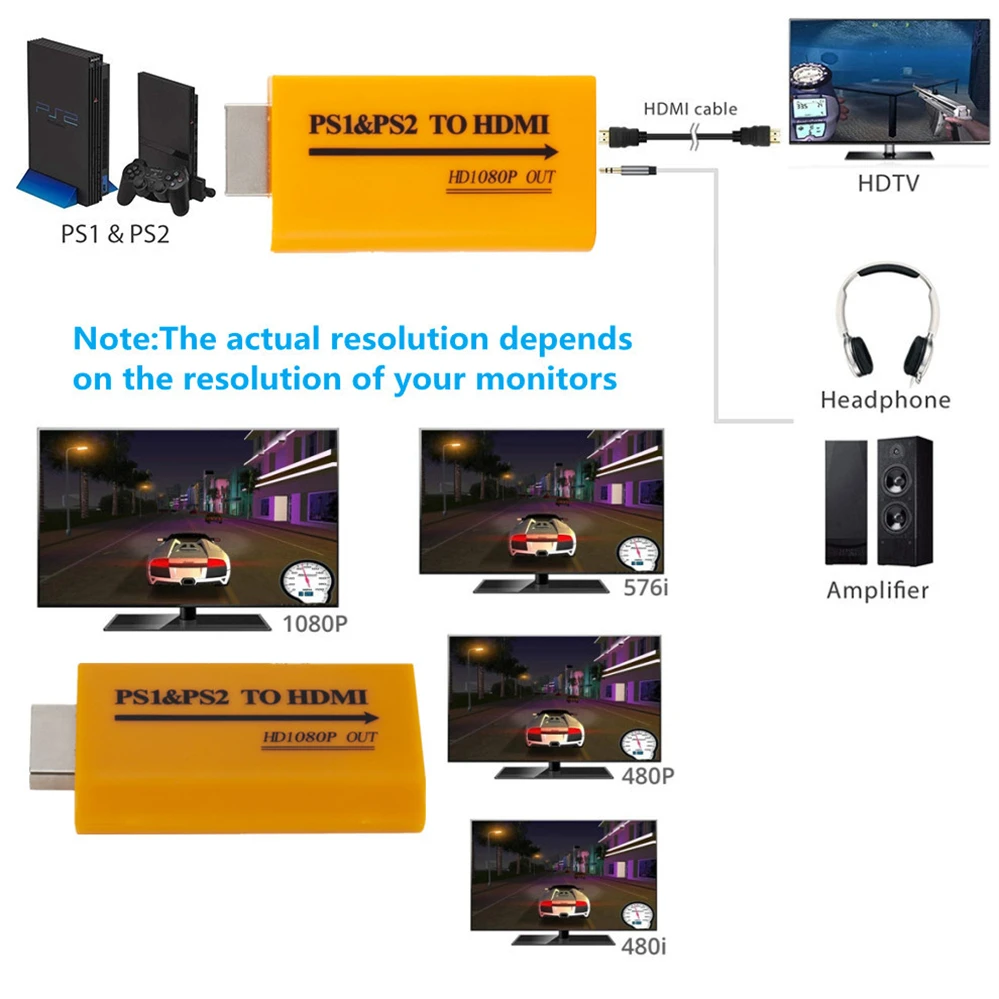 Las imágenes en vivo se transmiten en vivo en videojuegos sin demora. Con salida de audio analógica, puede conectar auriculares para evitar molestar a otros en Juegos Nocturnos. Convertidor de PS1 / PS2 a HDMI, convierte video/audio en PS1 / PS2 a HDTV o monitor, proyector y más. Todos los modos de visualización PS1 / PS2 (480i / 480p / 576i) son compatibles. Salida de vídeo y audio sincronizado en formato HDMI digital completo sin pérdida de transmisión. Las imágenes en vivo se transmiten en vivo en videojuegos sin demora. Con salida de audio analógica, puede conectar auriculares para evitar molestar a otros en Juegos Nocturnos. Convertidor de PS1 / PS2 a HDMI, convierte video/audio en PS1 / PS2 a HDTV o monitor, proyector y más. Todos los modos de visualización PS1 / PS2 (480i / 480p / 576i) son compatibles. Salida de vídeo y audio sincronizado en formato HDMI digital completo sin pérdida de transmisión. Las imágenes en vivo se transmiten en vivo en videojuegos sin demora. Con salida de audio analógica, puede conectar auriculares para evitar molestar a otros en Juegos Nocturnos. No hay cable desordenado, solo necesita un cable HDMI. (no incluido) Plug and play, sin necesidad de instalar controladores. Tamaño Mini, ligero y portátil.