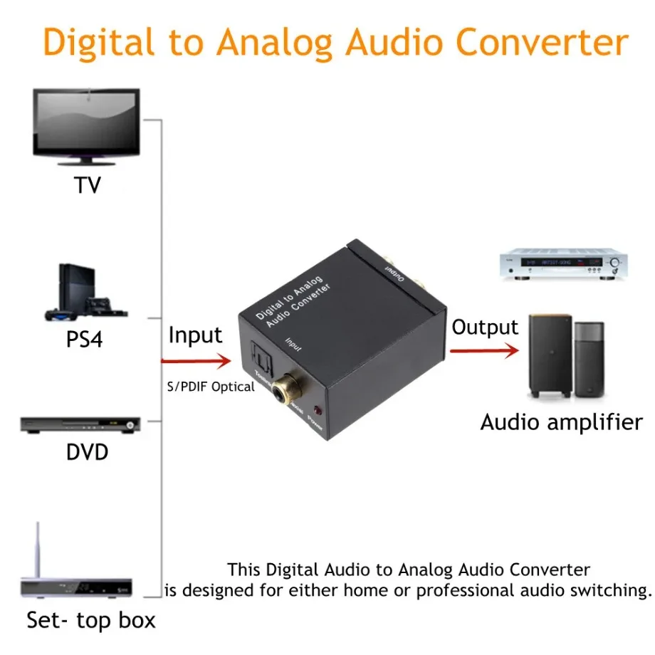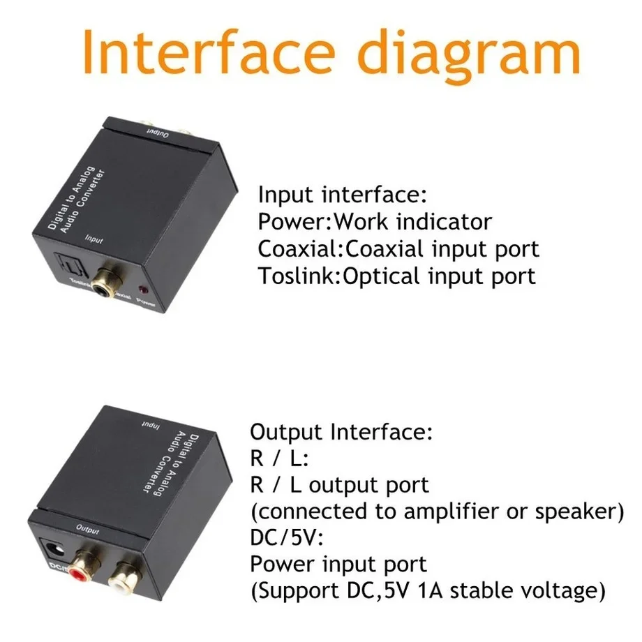 2. Convierte señales de audio PCM Digitales Coaxiales o Toslink en RCA L/R analógico y audio de 3,5mm simultáneamente (no se puede invertir).