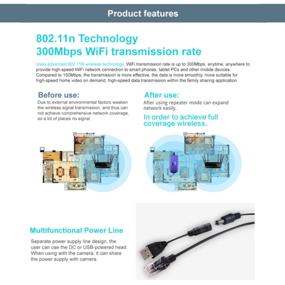 Soporta protocolo de transmisión WiFi 802.11b/G/n, velocidad de transmisión de 300Mbps.