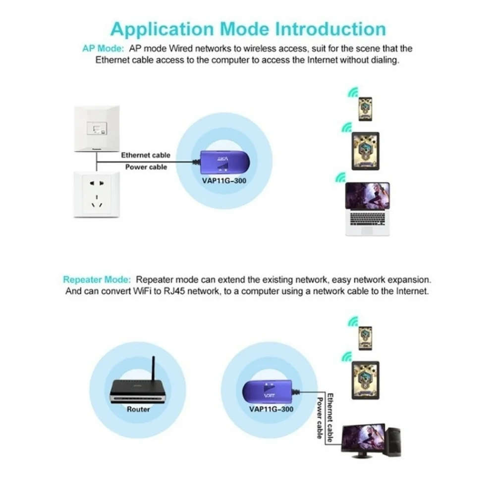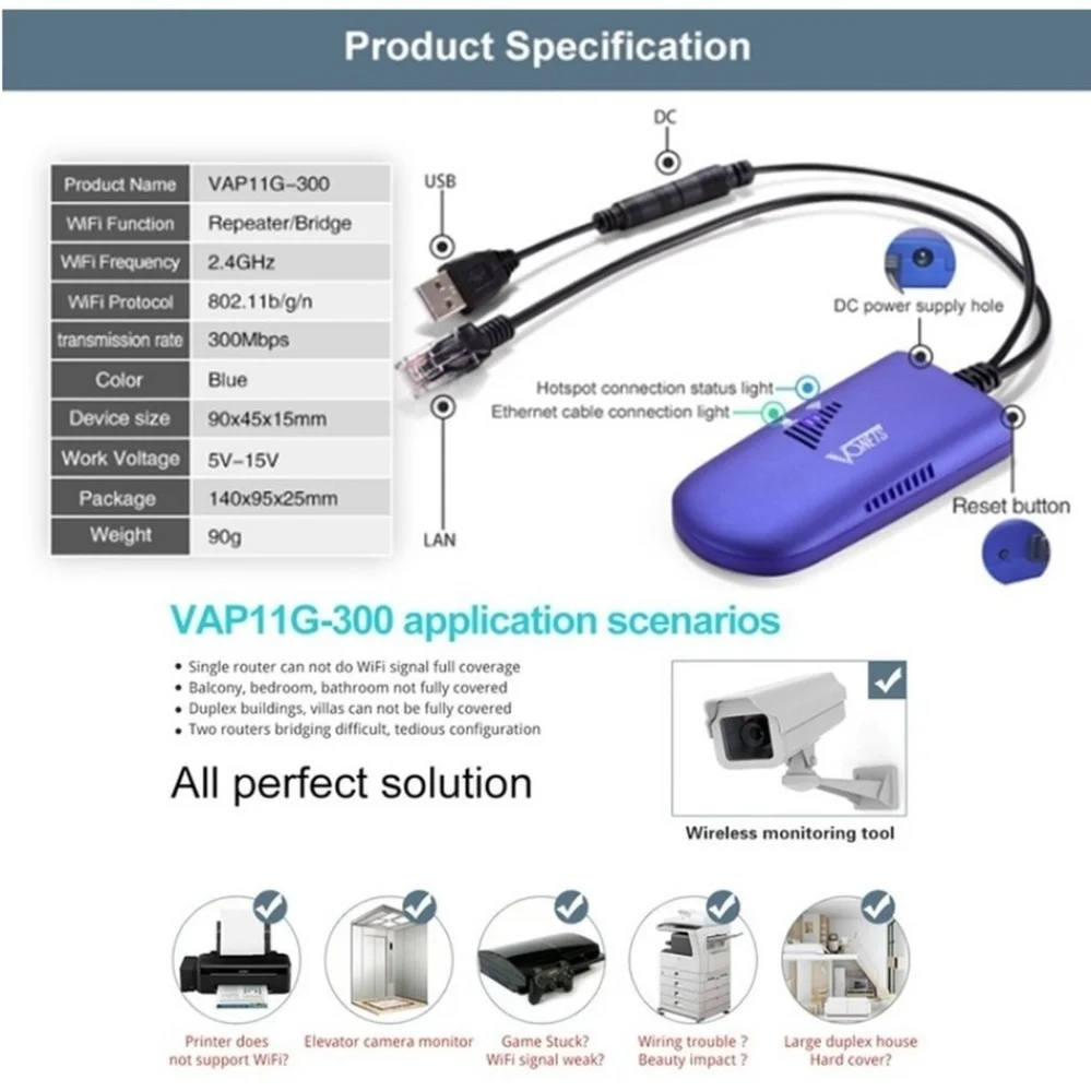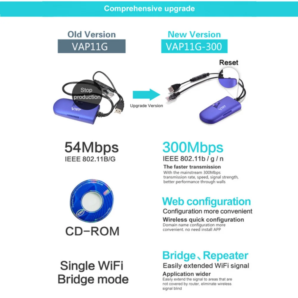 VAP11G-300 es un repetidor WiFi profesional de 300M, la temperatura D/A de la creación original se compensa por la tecnología de control de frecuencia automática (TAFC).