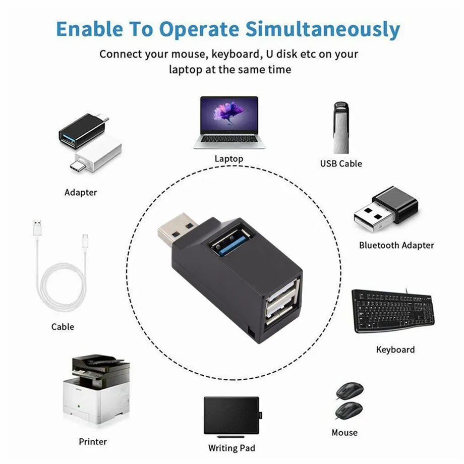 Mini concentrador adaptador USB 2.0 de 3 puertos.