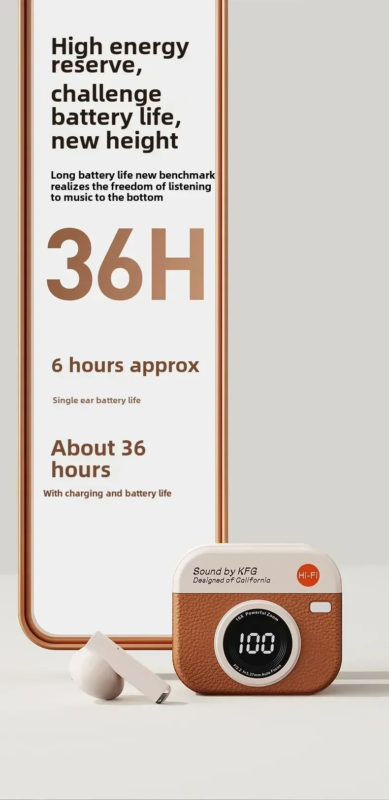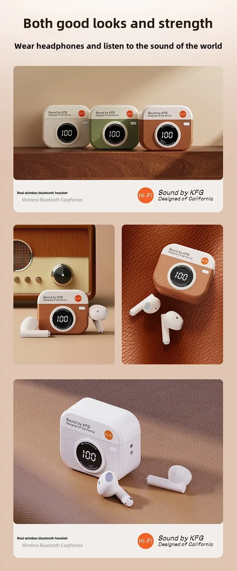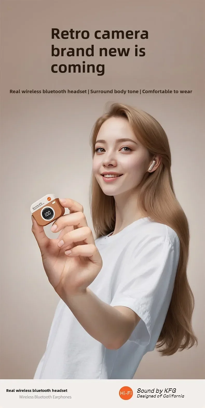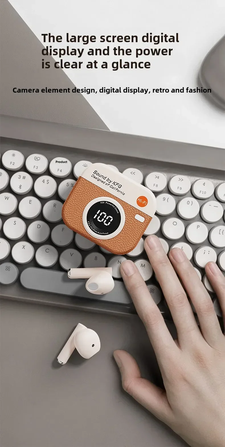 Q86Auriculares inalámbricos Bluetooth, cámara retro, pantalla creativa del nivel de batería, auriculares de música, batería de larga duración