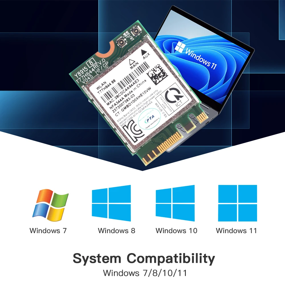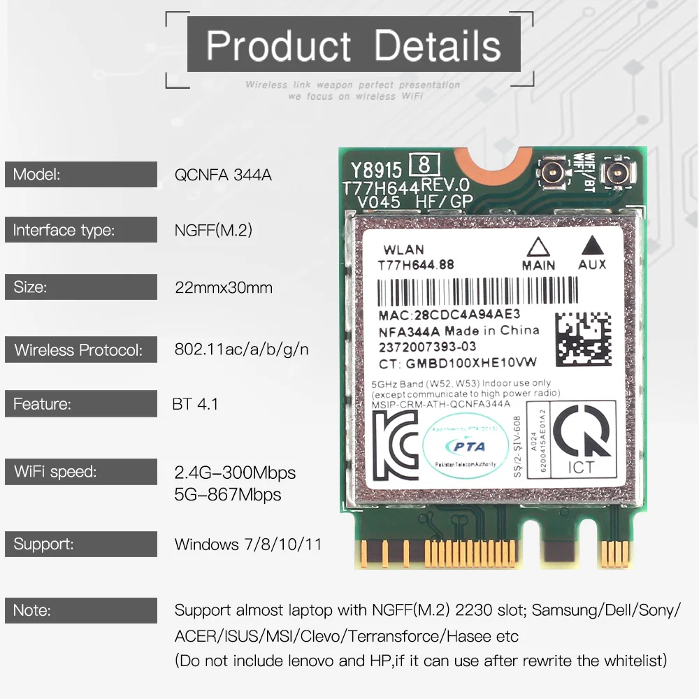 Comprar QCNFA344A-tarjeta WiFi inalámbrica, dispositivo de doble banda con Bluetooth 867, WLAN, Qualcomm Atheros, QCNFA344A, NGFF, M.2, 802.11AC, 4,1 Mbps
