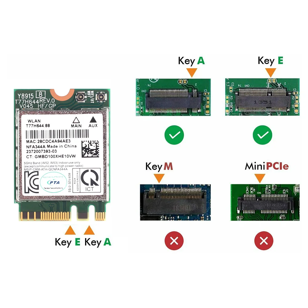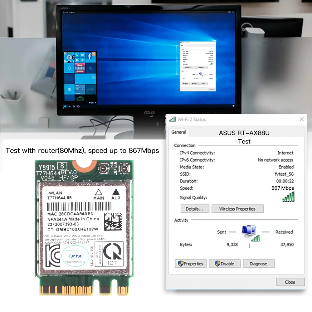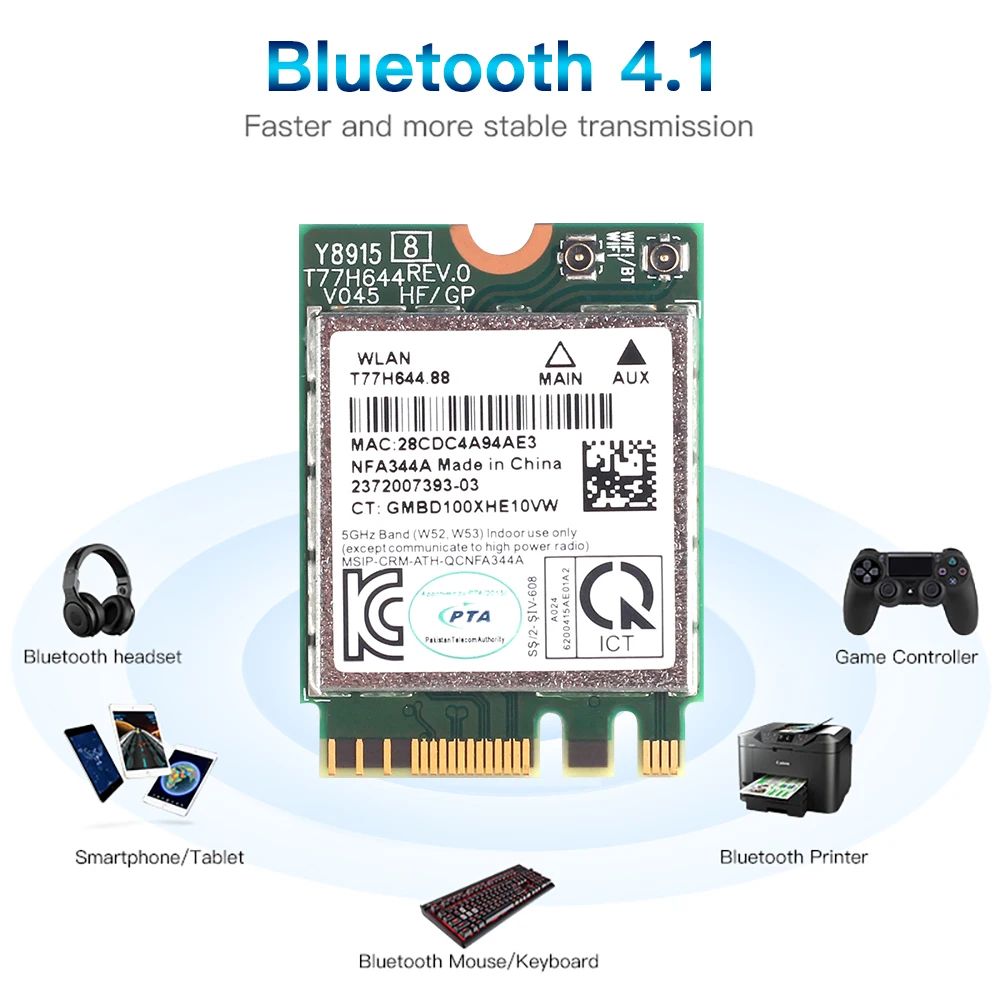 Comprar QCNFA344A-tarjeta WiFi inalámbrica, dispositivo de doble banda con Bluetooth 867, WLAN, Qualcomm Atheros, QCNFA344A, NGFF, M.2, 802.11AC, 4,1 Mbps