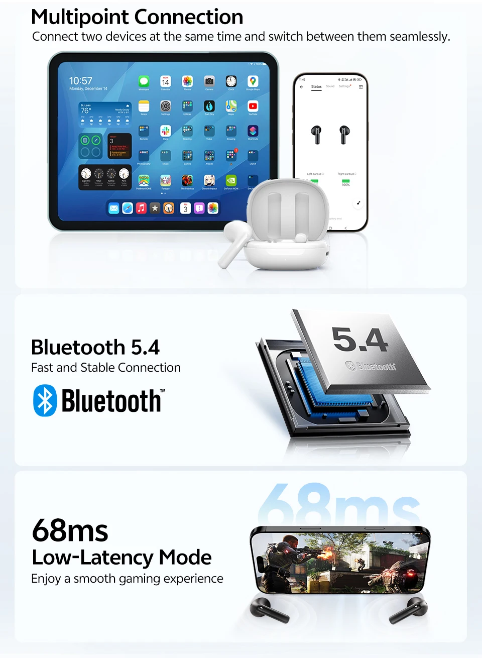 You can connect the earbuds to two devices at the same time. Seamless switch between them with simply one click; The latest Bluetooth 5.4 technology ensures faster transmission and more stable connection.