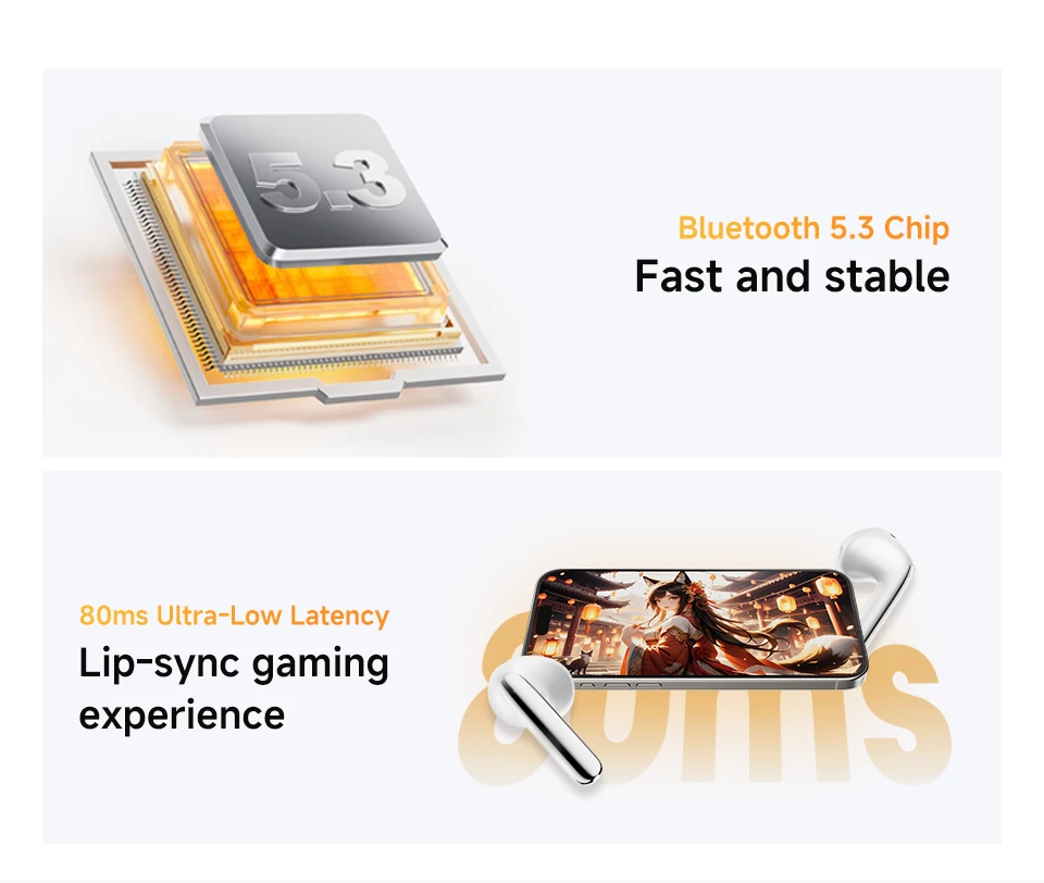 Con 50° Diseño semi-in-ear, el diseño ergonómico de los auriculares inalámbricos QCY HT10 AilyBuds Pro+ proporciona una experiencia de uso de ajuste estable y cómoda desde adentro hacia afuera, sumérgete en música, contenido y juegos.