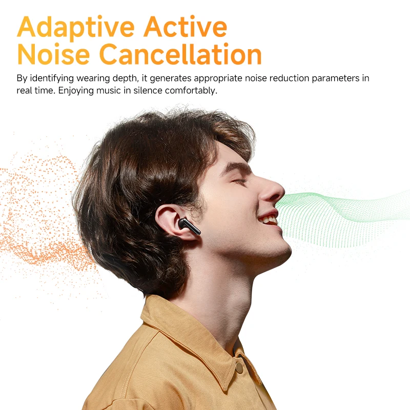 [Cancelación activa de ruido híbrida adaptativa]-En ANC, los auriculares inalámbricos se adaptarán automáticamente a su canal auditivo, detectarán dinámicamente los cambios en el ruido ambiental y el estado de uso, y ajustarán y combinarán dinámicamente los parámetros de cancelación de ruido más adecuados en tiempo real, asegurando que el ruido ambiental se elimine de manera efectiva.El diseño también incorpora una estructura de ruido antiviento resistente al agua IPX5 y adaptable, lo que los hace ideales para actividades al aire libre.