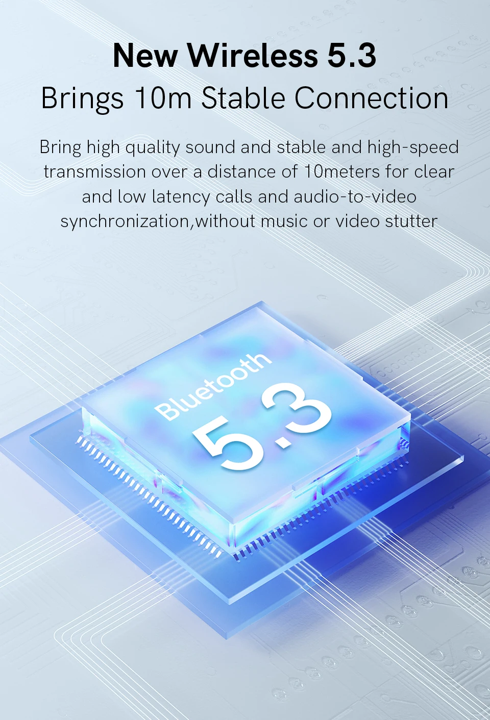 Los nuevos chips inalámbricos V5.3 brindan un sonido de alta calidad y una transmisión estable y de alta velocidad a una distancia de 10 metros para llamadas claras y de baja latencia y sincronización de audio a video, sin tartamudeo de música o vídeo.