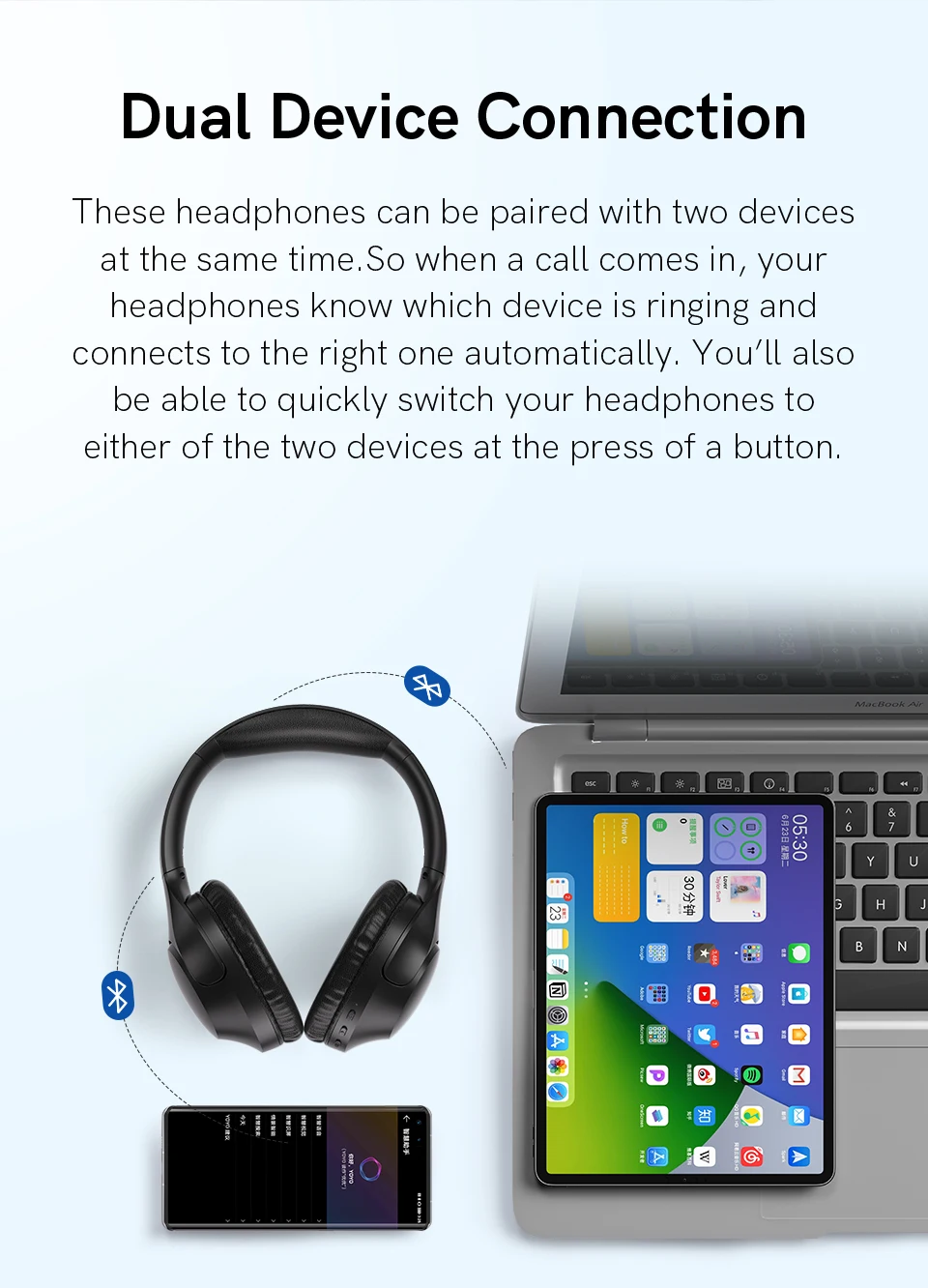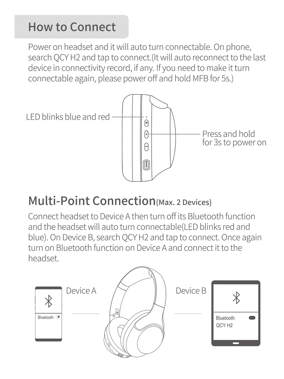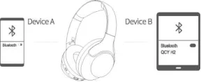 Conecte los auriculares al dispositivo A, luego apague su función Bluetooth y los auriculares se conectarán automáticamente (El LED parpadea en rojo y azul). En el dispositivo B, busque QCY H2 y toque para conectar Una vez más, active la función Bluetooth en el dispositivo A y conéctelo a los auriculares
