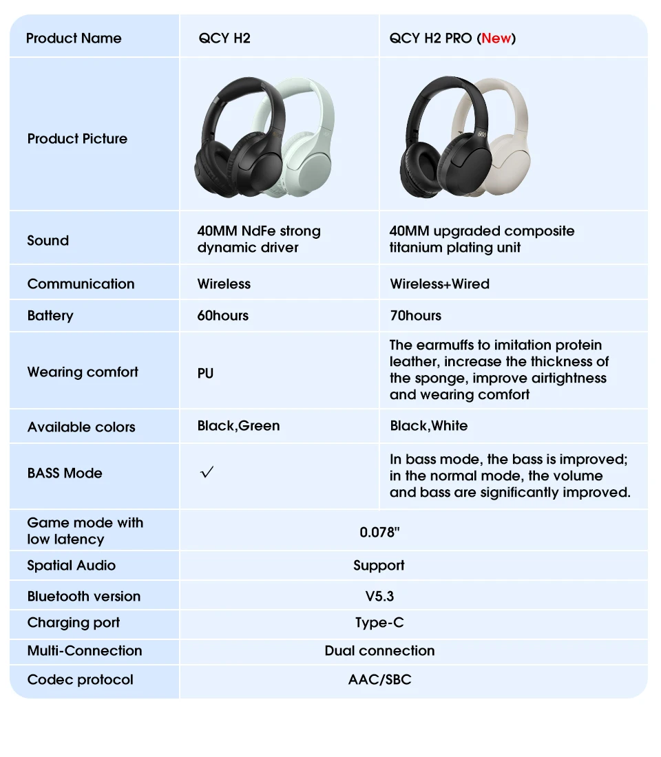 Comprar QCY-auriculares inalámbricos H2 H2pro, cascos con Bluetooth 5,3, graves, HIFI estéreo, 78ms, baja latencia, para juegos de música, 60H de tiempo de reproducción