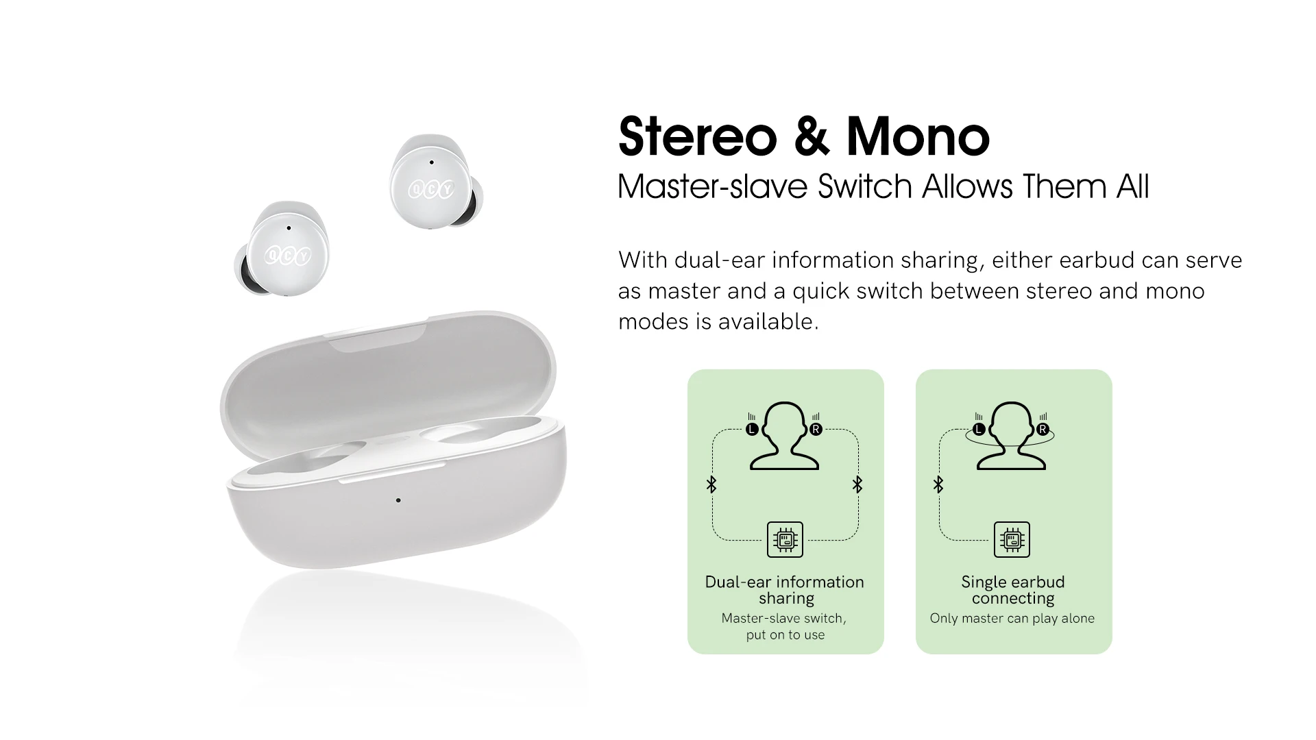 Con el uso compartido de información de doble oído, cualquiera de los auriculares pueden servir como maestro para una reconexión rápida y un interruptor estéreo-mono.
