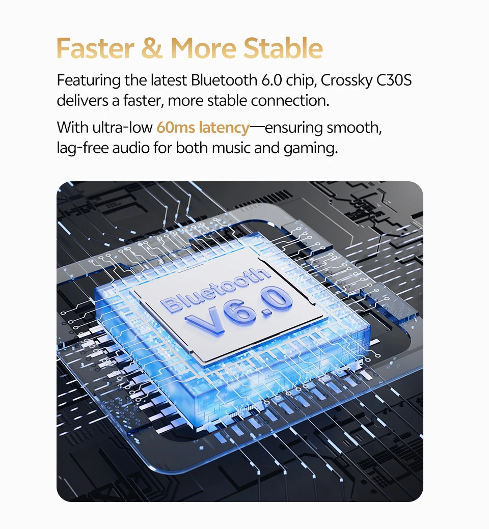 Con el último chip Bluetooth 6.0, Crossky C30S ofrece una conexión más rápida y estable.