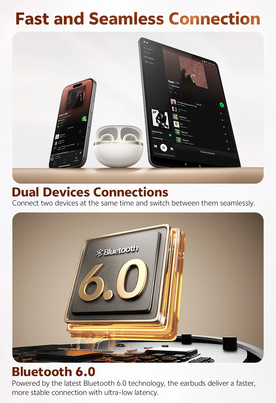 Alimentados por la última tecnología Bluetooth 6.0, los auriculares ofrecen una conexión más rápida y estable con latencia ultrabaja.