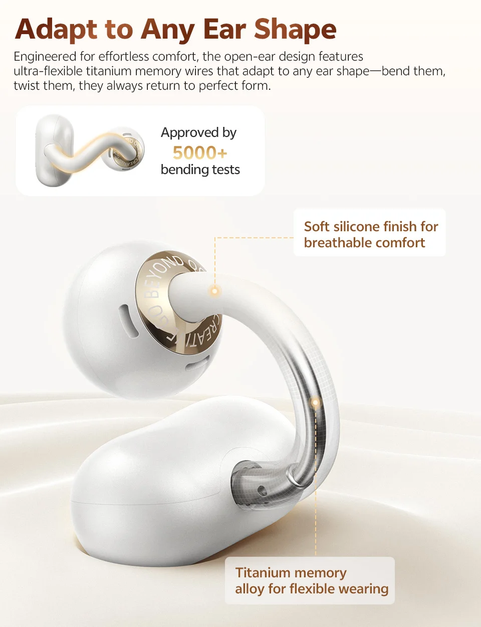 Diseñados para brindar comodidad sin esfuerzo, el diseño de oreja abierta presenta cables de memoria de titanio ultraflexibles que se adaptan a cualquier forma de oreja: doblanelos, gírelos y siempre vuelven a su forma perfecta.