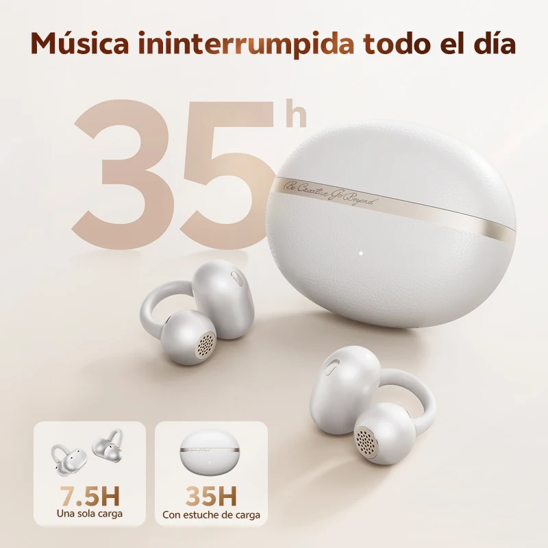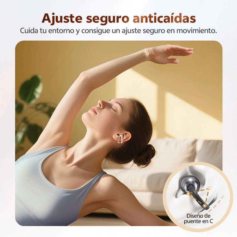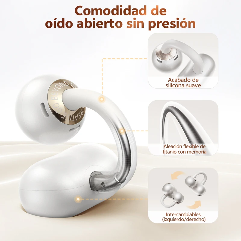 Diseñados para brindar comodidad sin esfuerzo, el diseño de oreja abierta presenta cables de memoria de titanio ultraflexibles que se adaptan a cualquier forma de oreja: doblanelos, gírelos y siempre vuelven a su forma perfecta.